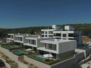 A modern house is for sale, located in Sv. Filip i Jakov. The house offers a beautiful view of the sea.The layout consists of a ground floor, hallway, bedroom, bathroom, kitchen with dining room and living room, and an uncovered terrace. Internal stairs lead to the first floor where there is a hallway and two bedrooms, each with its own bathroom and wardrobe.The net usable area of the described rooms is 150.61 m², while the total net area with accessories (parking, garden) is 158.74 m². The garden has an area of 41.11 m², and it contains a pool of 18 m².The distance from this property to the sea and the center is 800 m.The expected completion date for the house is autumn 2026.