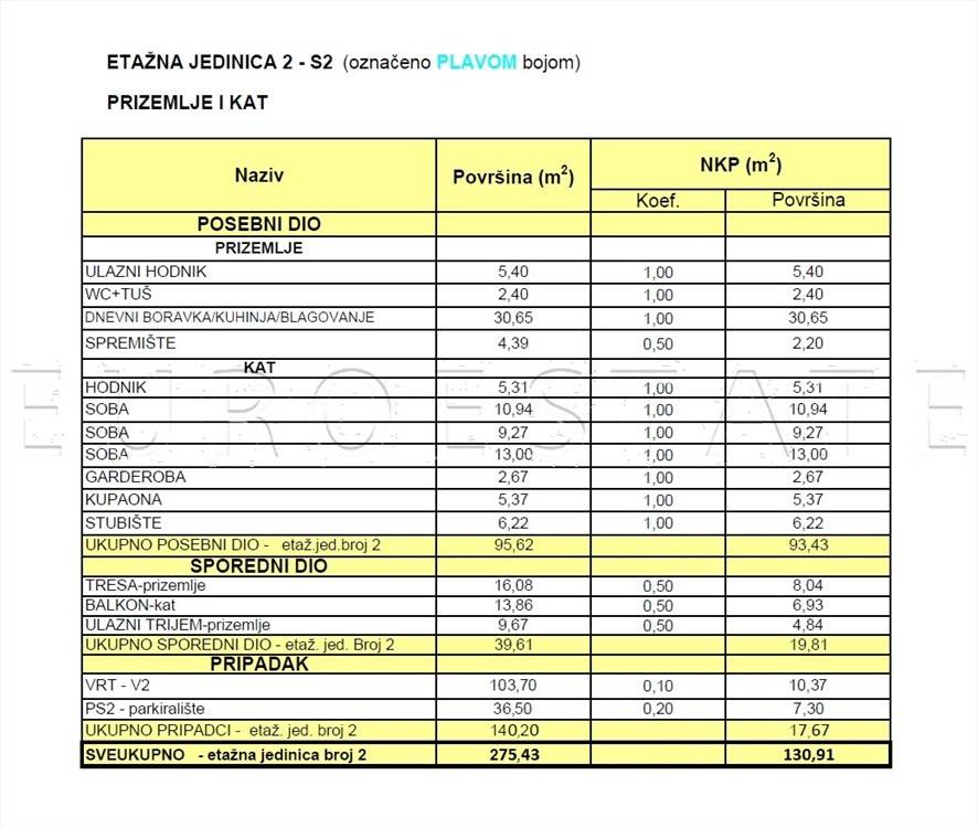 - sveukupna površina nekretnine je 275.43 m2, a neto obračunska površina je 130.91 m2,