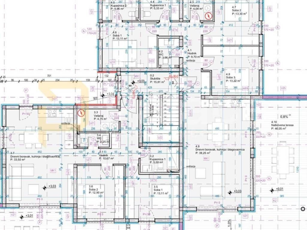 Apartment S3, with a total size of 103 m2, is situated on the first floor and conceptually divided into two parts, sleeping and social areas. The total net area of the residential space is 82.18 m2, while the remaining part consists of an external covered terrace with a view of the sea and two parking spaces belonging to it. The sleeping area consists of two bedrooms, along with a bathroom, additional toilet, and laundry room. The hallway connects the sleeping area with a kitchen and dining area and living room combined in an open concept that creates a cozy space for socializing.