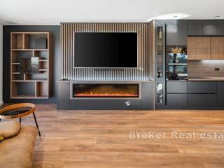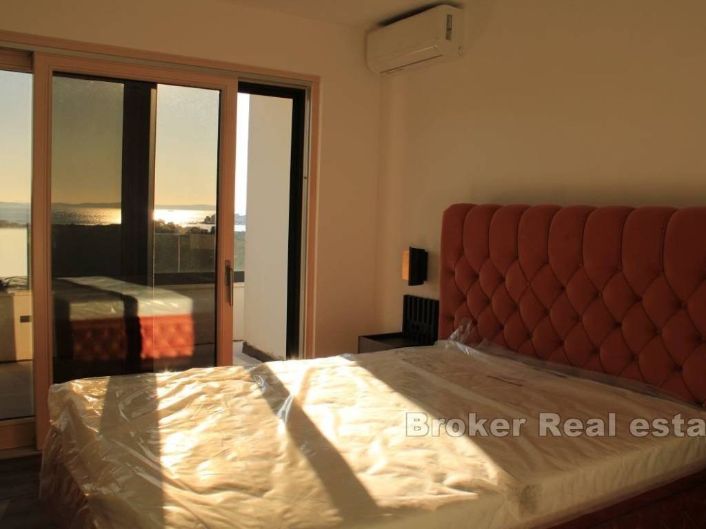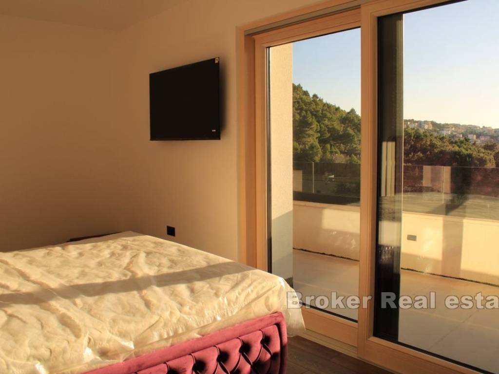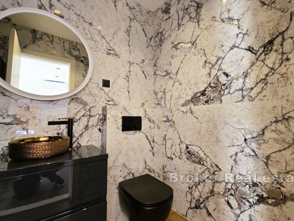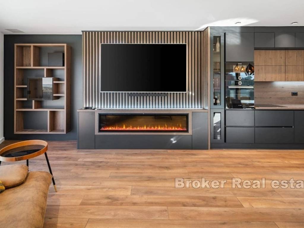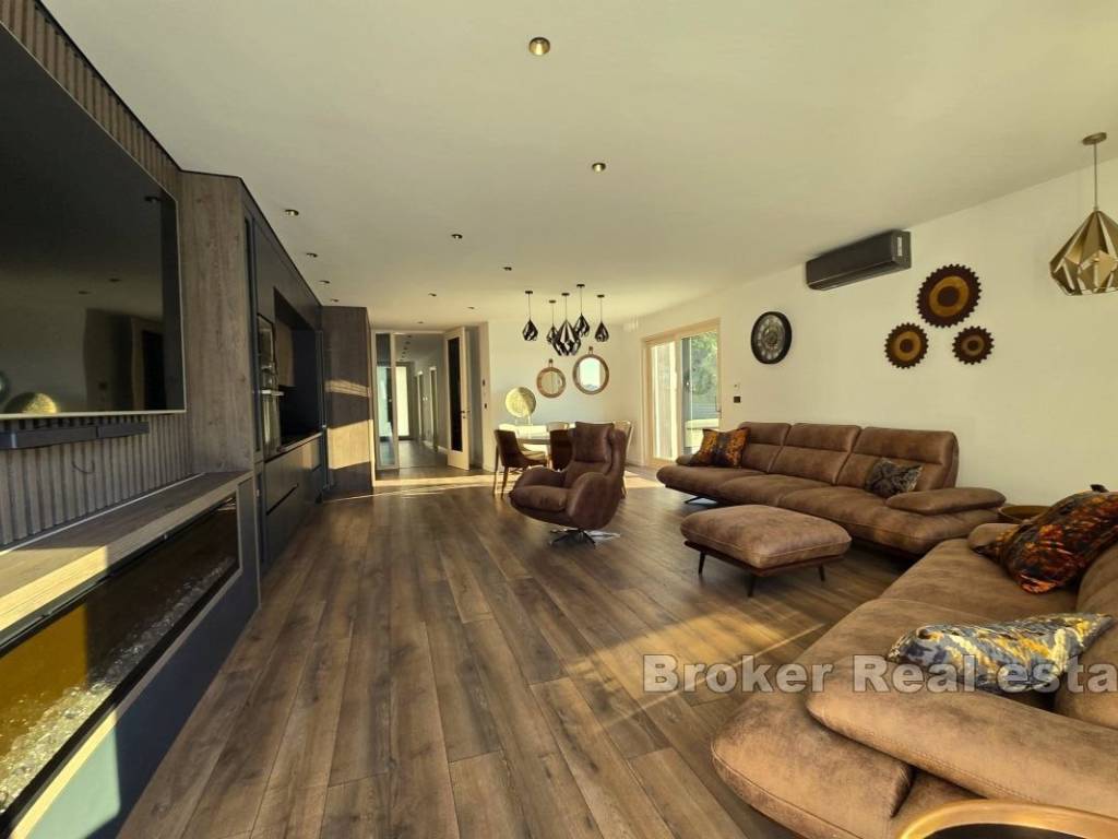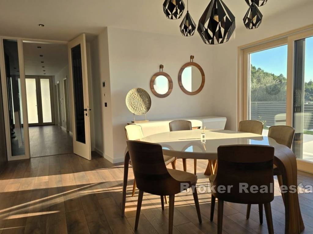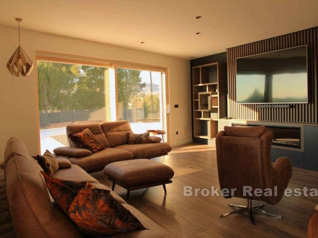 Luxuriously furnished villa for rent, located in a unique location, near Split. The living area of the property is approximately 190m2, on a plot of 830m2. It extends over two floors with a large terrace, sundeck and swimming pool and an auxiliary building in the yard that is designed as a summer kitchen for perfect gatherings by the pool. The villa consists of a ground floor and first floor. The ground floor consists of a control room and laundry room, bathroom, bedroom with bathroom and walk-in closet, kitchen with dining room and living room with direct access to the terrace with swimming pool. The first floor is provided for two spacious bedrooms with their own walk-in closet and bathroom. The property offers a beautiful view of Stobreč, Split and the surrounding area. The orientation of the property is southwest, which further contributes to the comfort of staying in the property due to the sun that shines on it throughout the year. It is located just a few minutes from the beach. Underfloor heating extends throughout the villa, and additional heating and cooling are provided by the air conditioners in each room. The building was built in 2024. The property has never been occupied yet. In front of the house there are two comfortable garages, while behind the house there is a large parking lot for approximately 4 cars. All necessary facilities for everyday life are located in the immediate vicinity of the property. The distance of the property from the city of Split, by car, is only a 10 minutes, while it is 30 minutes by car to the Split airport. The villa is rented for a long-term period. Utilities are not included in the rental price.