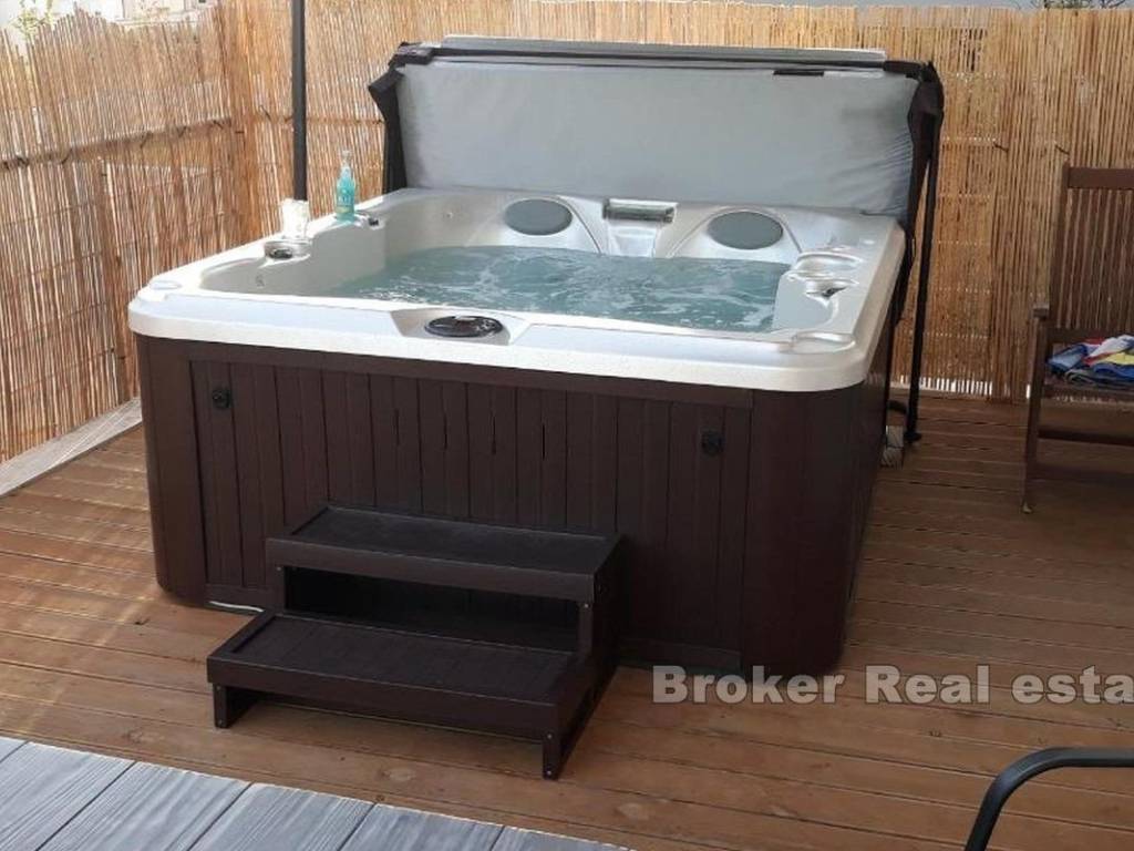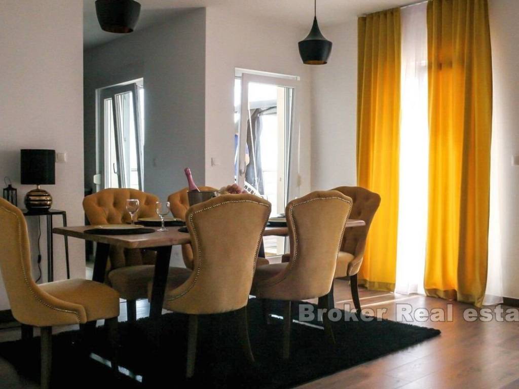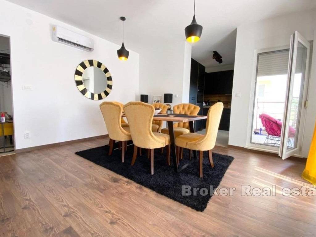 Luxuriously furnished three-bedroom apartment in Žnjan, for rent. It is located on the high ground floor of a residential building, is southeast oriented and is rented fully furnished.   It has 76.58 m² of living space and consists of a kitchen with dining room and living room, three bedrooms, hallway, entrance hall, bathroom and toilet. The exterior of the apartment consists of a 40.20 m² terrace equipped with a massage tub.   The apartment is air-conditioned, and parking can be easily found near the building. All necessary amenities for quality urban living are nearby.