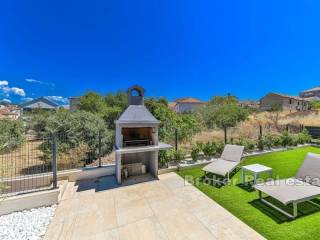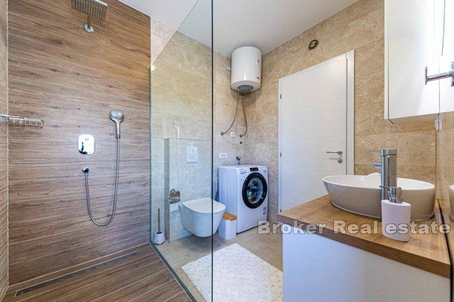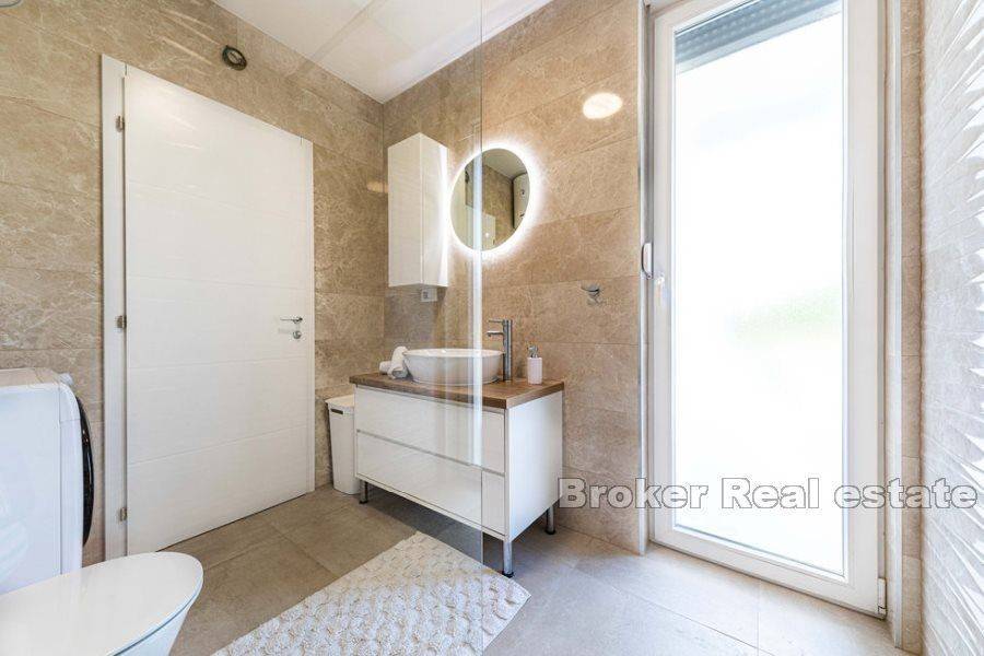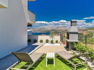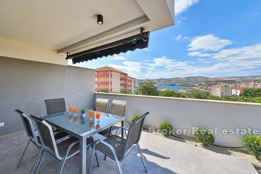 Luxurious one bedroom apartment in a new building in Okrug Gornji, with a view of the sea and a garden, for rent. It is located on the ground floor of a smaller residential building and is surrounded by newly built modern buildings.   The apartment has 41,80 m² of living space and 74,4 m² of outdoor space and consists of an entrance area, a living area consisting of a kitchen, dining room and living room, as well as bedroom and bathroom. Of the outdoor space, three covered and two uncovered terraces and two gardens stand out.   The apartment is airconditioned and fully furnished and equipped and is rented as such. It has an outdoor parking space and the pool is available for shared use by all tenants. The apartment also has two gardens with a barbecue and deckchairs. Among the equipment, burglar proof doors, mosquito nets, electric shutter lifters and video surveillance stand out.   The apartment is an excellent choice for urban life, as all the necessary amenities are 500 m away and the airport is some 8,5 km away.