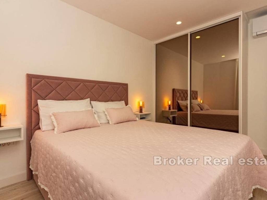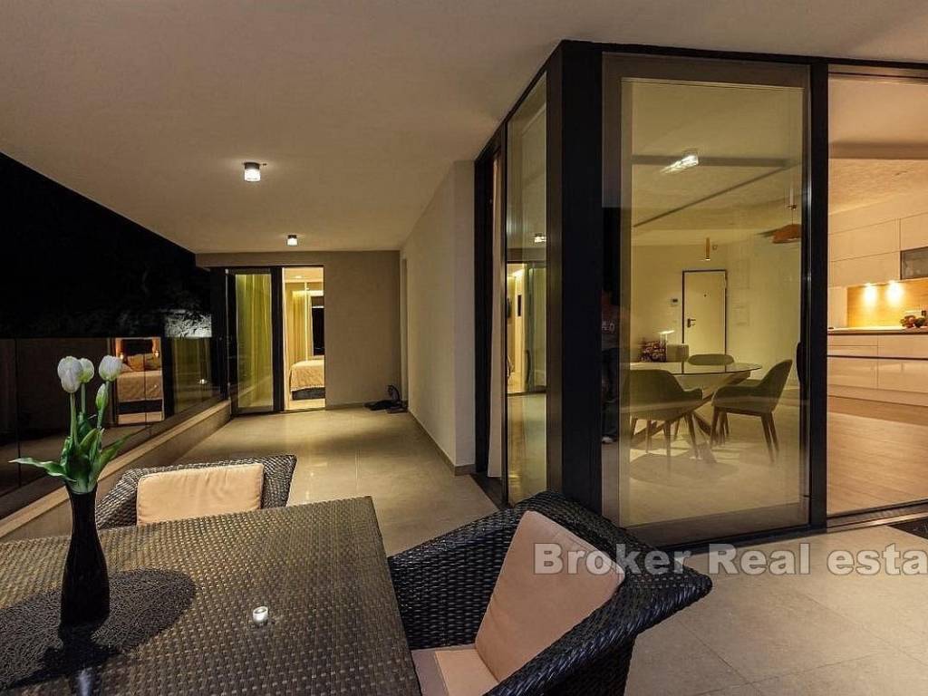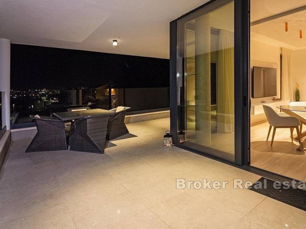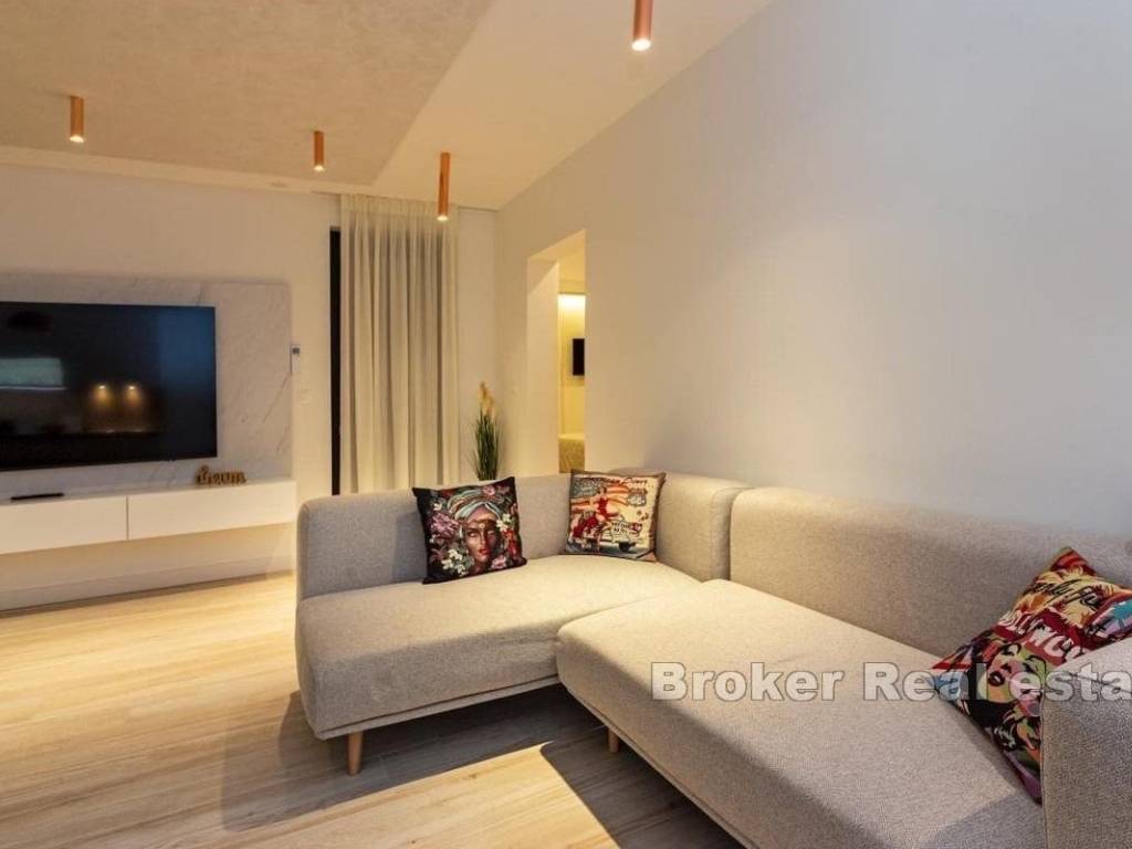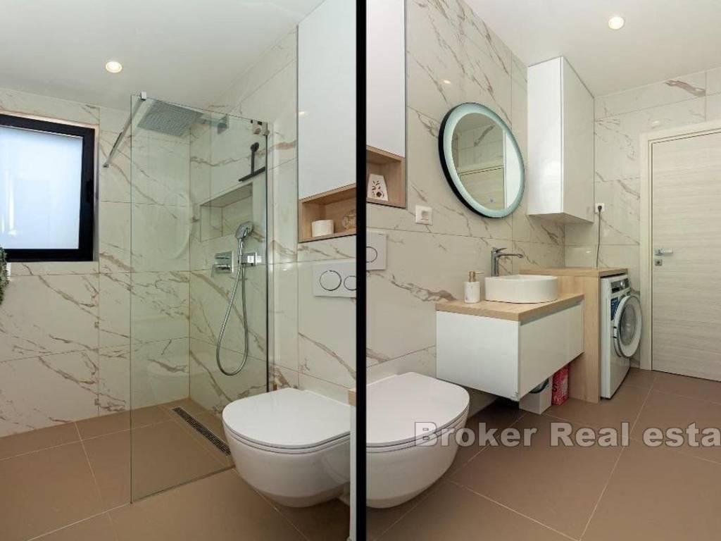 Two-room penthouse located in a wonderful location in Podstrana, for long-term rent. The penthouse is located on the second floor of a residential building in a desirable neighborhood and has a southern orientation. The penthouse is over 60 m2, and it also has a large covered terrace of 30 m2 with an open view of the sea. It consists of a hallway, two bedrooms, two bathrooms, a toilet, a kitchen and a living room consisting of a dining room and a living room with access to a spacious terrace. It is fully furnished and equipped and is rented as such. Heating and cooling is provided by air conditioning and underfloot heating, and the penthouse provides an outdoor parking space and a garage. In the immediate vicinity there is a shop, a bakery, a school and all other facilities necessary for quality urban living.