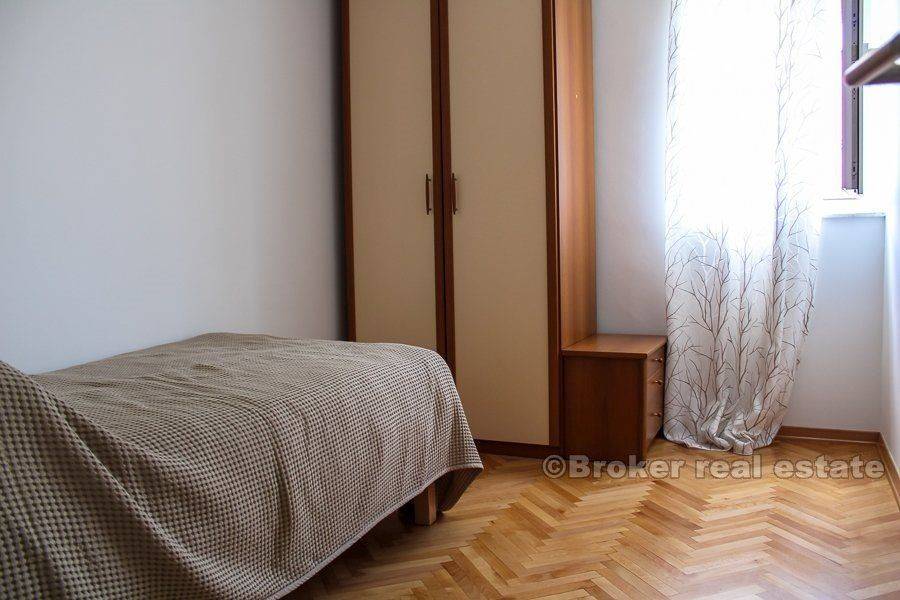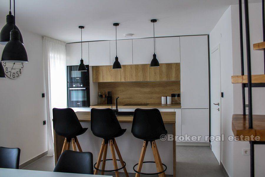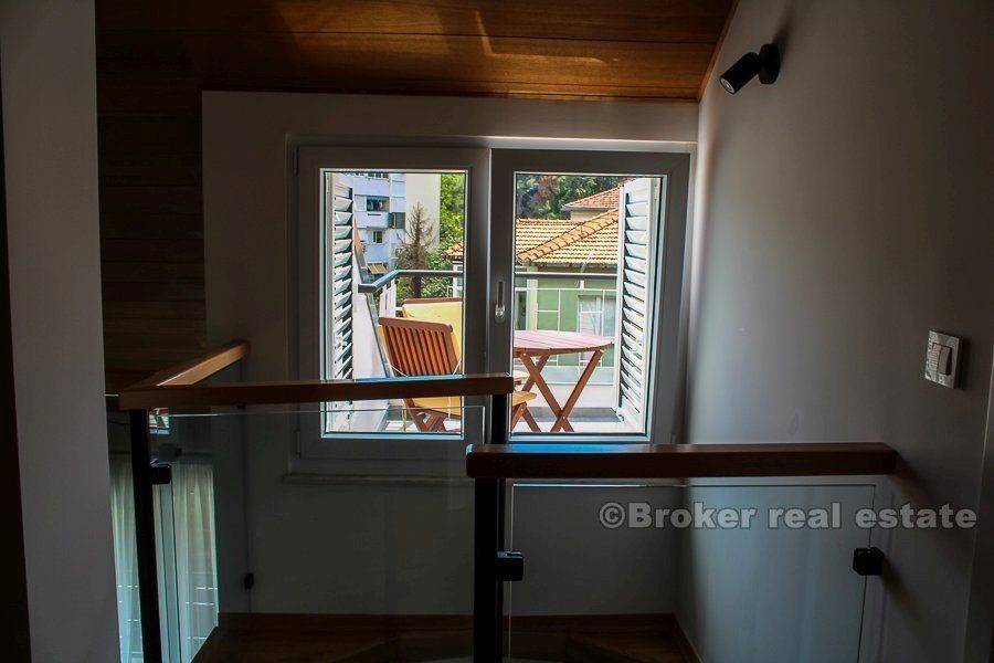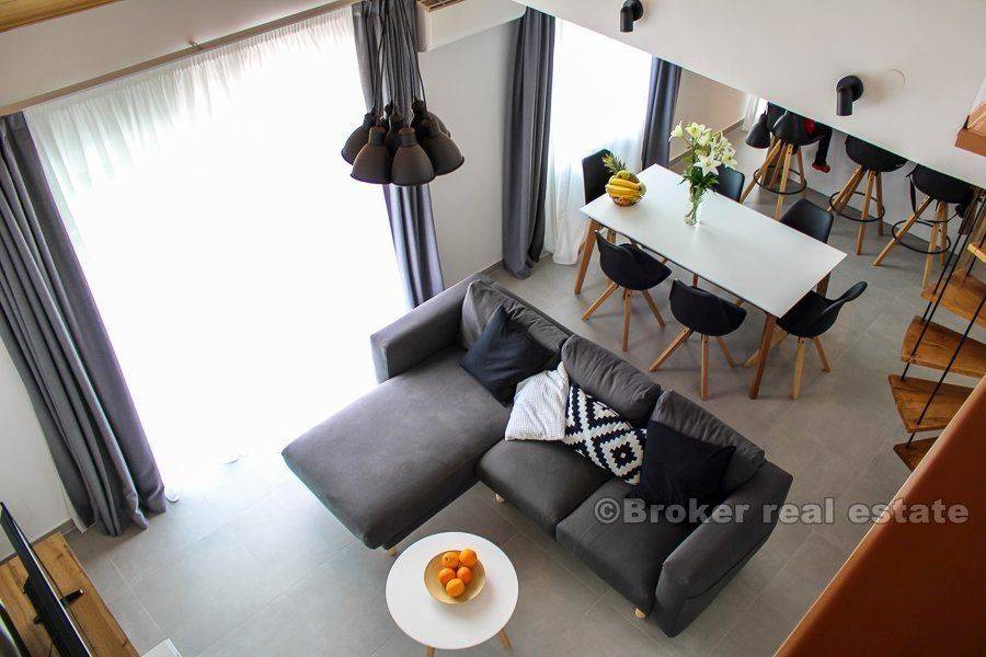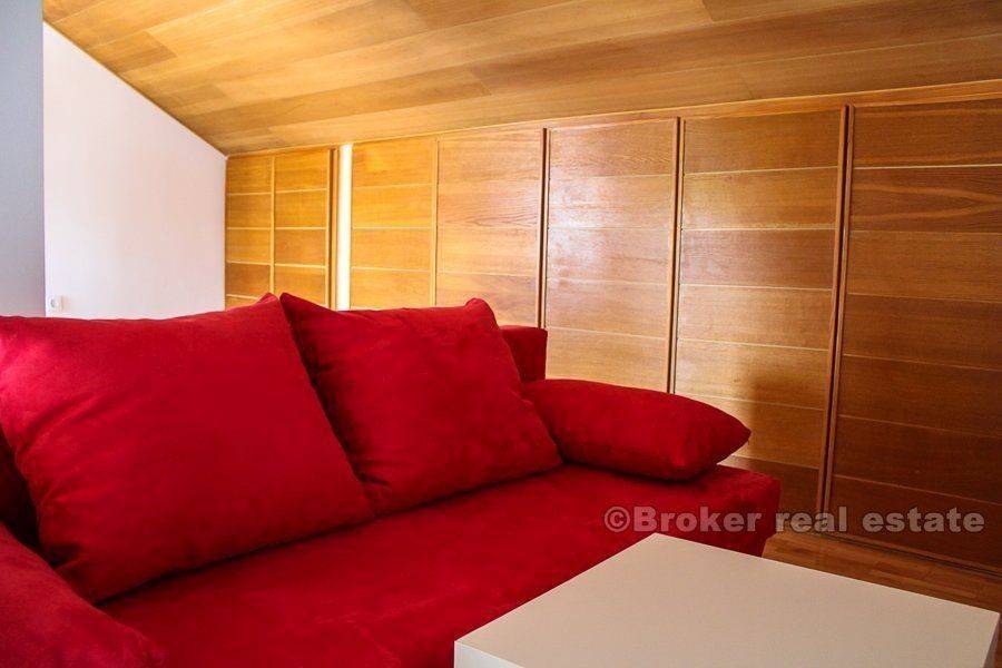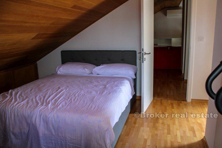 Modern, fully renovated duplex penthouse, located on the second floor of the house. Orientation south- east. The apartment is equipped with all appliances (water crane, kitchen appliances, washing machine) and is fully furnished. Underfloor heating in a the whole apartment exception rooms where there is air conditioners. On the first floor of the apartment are 3 bedrooms, one of which has its own bathroom and the other two have one shared bathroom, kitchen with dining room, small storage, large living room with a nice fireplace and a balcony of 10 m2. On the second floor is a large room with built-in wardrobes and a small balcony, a separate gallery with a living room, cupboards and a library. The floors are connected with a nice wooden staircase. The apartment has one parking space in the courtyard. The apartment is located in a quiet residential area of Bol, close to the school, the shop, the Joker Center, only 15 m from the city center and other important facilities. * Considering the volatility and dynamics of renting, the ad is informative and does not necessarily mean that this apartment is available for rent. For current information, please contact us.