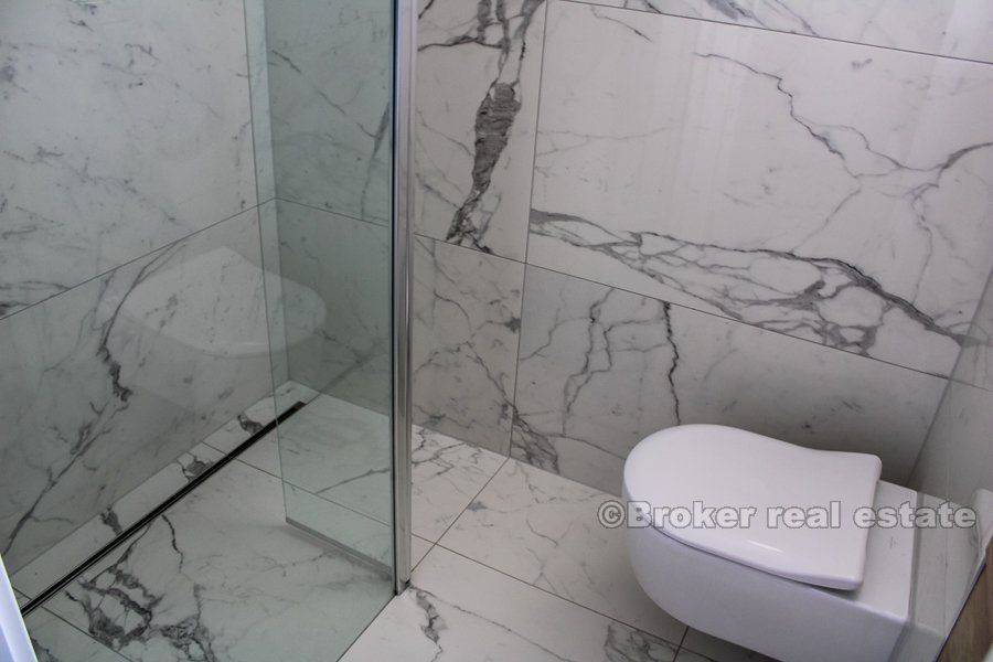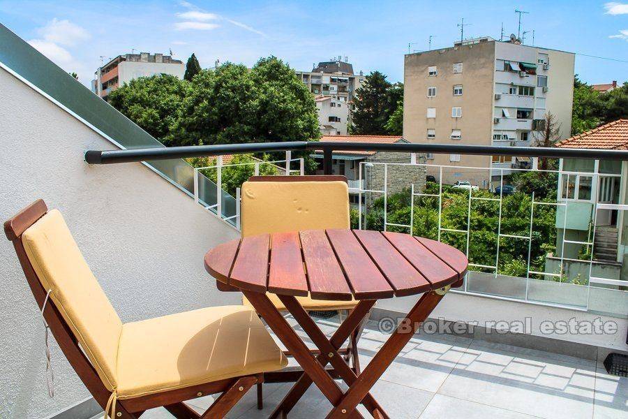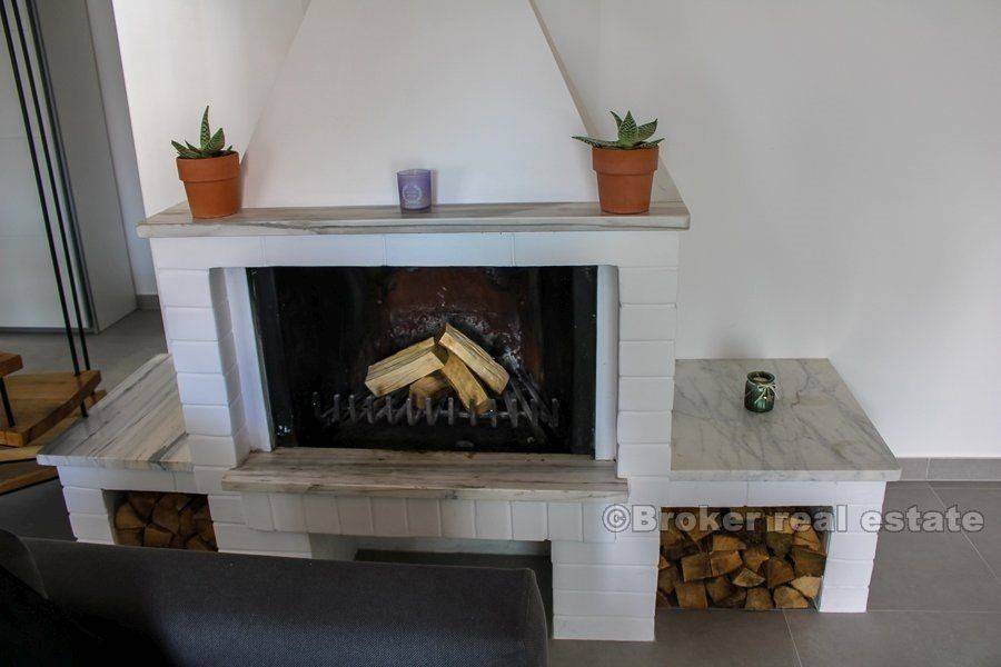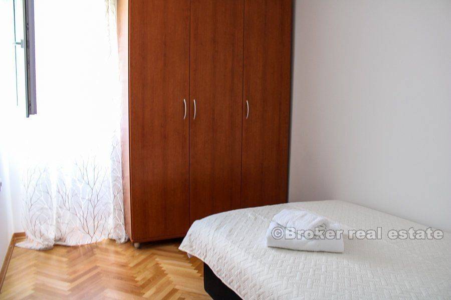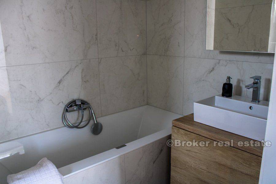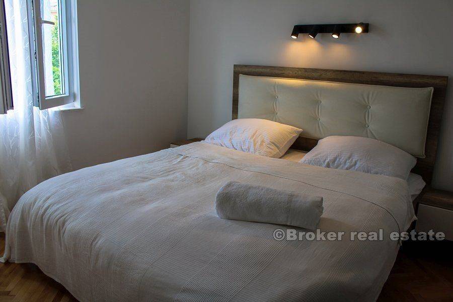 Modern, fully renovated duplex penthouse, located on the second floor of the house. Orientation south- east. The apartment is equipped with all appliances (water crane, kitchen appliances, washing machine) and is fully furnished. Underfloor heating in a the whole apartment exception rooms where there is air conditioners. On the first floor of the apartment are 3 bedrooms, one of which has its own bathroom and the other two have one shared bathroom, kitchen with dining room, small storage, large living room with a nice fireplace and a balcony of 10 m2. On the second floor is a large room with built-in wardrobes and a small balcony, a separate gallery with a living room, cupboards and a library. The floors are connected with a nice wooden staircase. The apartment has one parking space in the courtyard. The apartment is located in a quiet residential area of Bol, close to the school, the shop, the Joker Center, only 15 m from the city center and other important facilities. * Considering the volatility and dynamics of renting, the ad is informative and does not necessarily mean that this apartment is available for rent. For current information, please contact us.