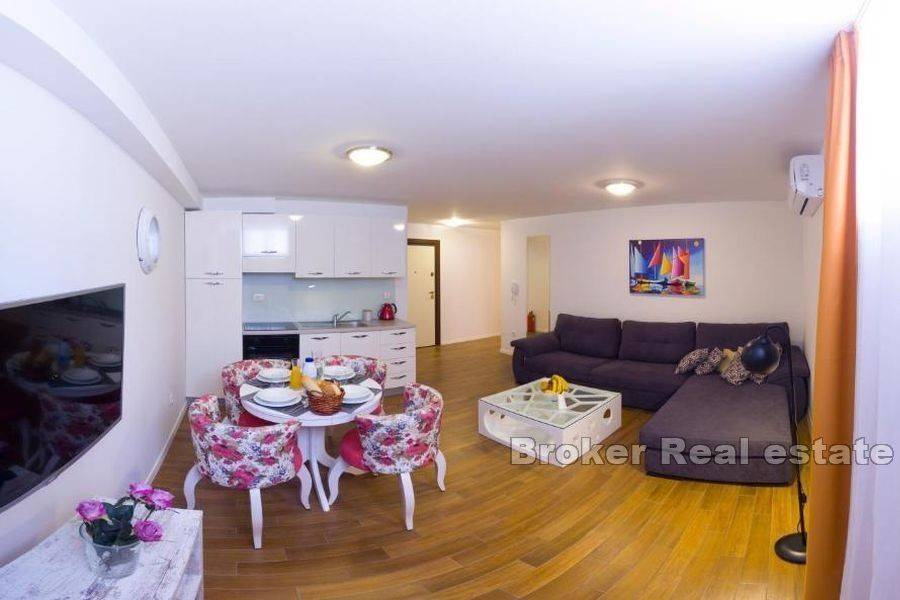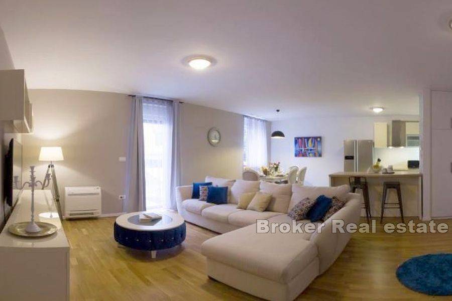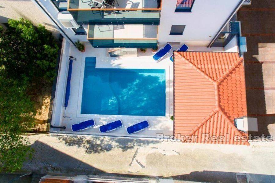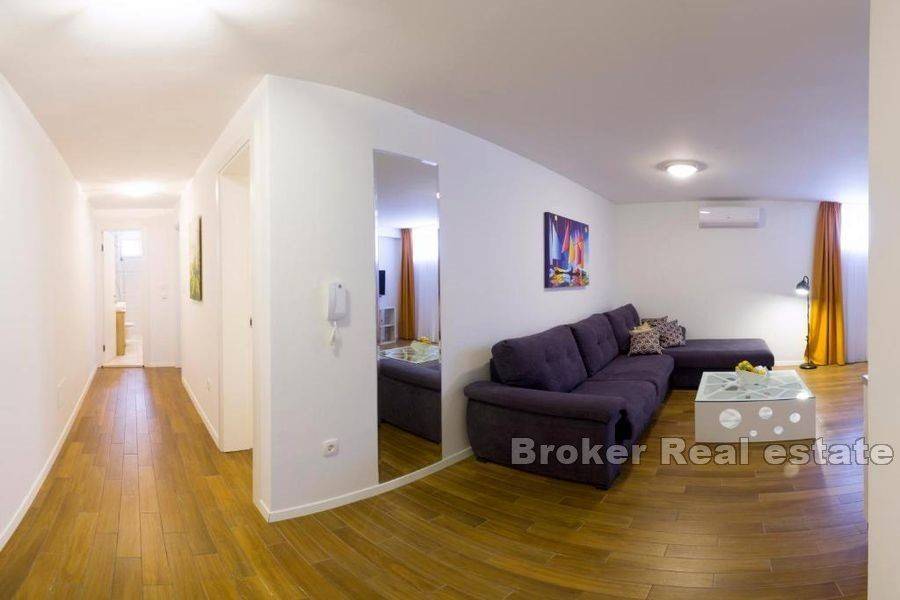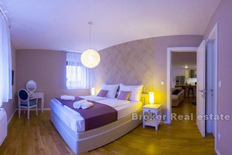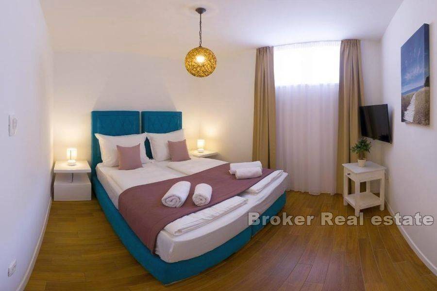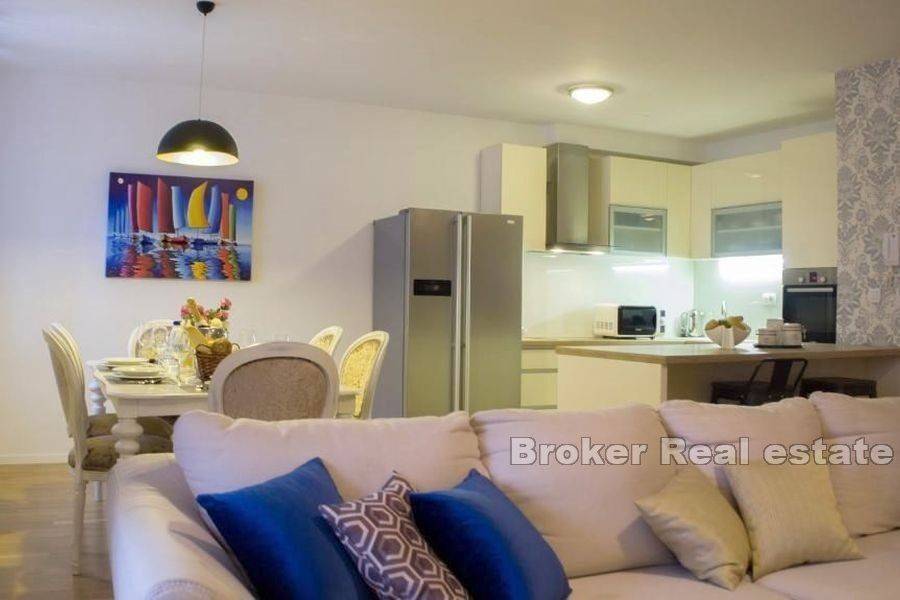 Modern two apartments located in a newer residential building in Bačvice. Three bedroom apartment located on the ground floor and two bedroom located in the basement of the building. The property has a courtyard with pool, canopy and fireplace. The apartment on the ground floor consists of three bedrooms, two bathrooms, kitchen with dining room, living room with exit to the yard of 100m2. The second apartment (basement) consists of two bedrooms, bathroom, kitchen with dining area and living room. The apartments are furnished and equipped. The property has two parking spaces. Possibility to rent only a ground floor apartment with a private yard. Rental period by arrangement. * Considering the volatility and dynamics of renting, the ad is informative and does not necessarily mean that this apartment is available for rent. For current information, please contact us.