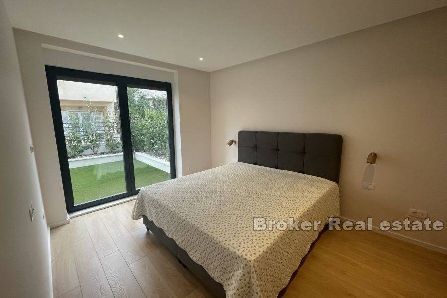 Brand new, furnished two-room apartment located on the first floor of a luxury villa near the city center. Living area 70m2 with a terrace of 45m2. Modernly equipped, built in 2022, first move-in. It consists of a large open space with a kitchen and a living room with a discreet exit to a spacious terrace with artificial grass. Two bedrooms and a large bathroom. The apartment is fully furnished and equipped with custom-made furniture. Underfloor heating was implemented throughout the entire space. It has its own parking space. Utilities are not included in the price. Pets are allowed. * Considering the volatility and dynamics of renting, the ad is informative and does not necessarily mean that this apartment is available for rent. For current information, please contact us.