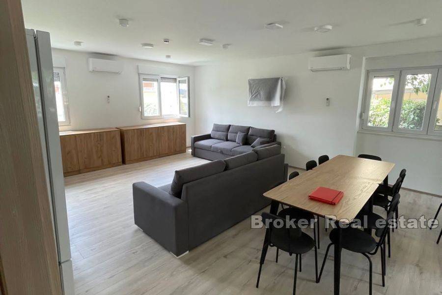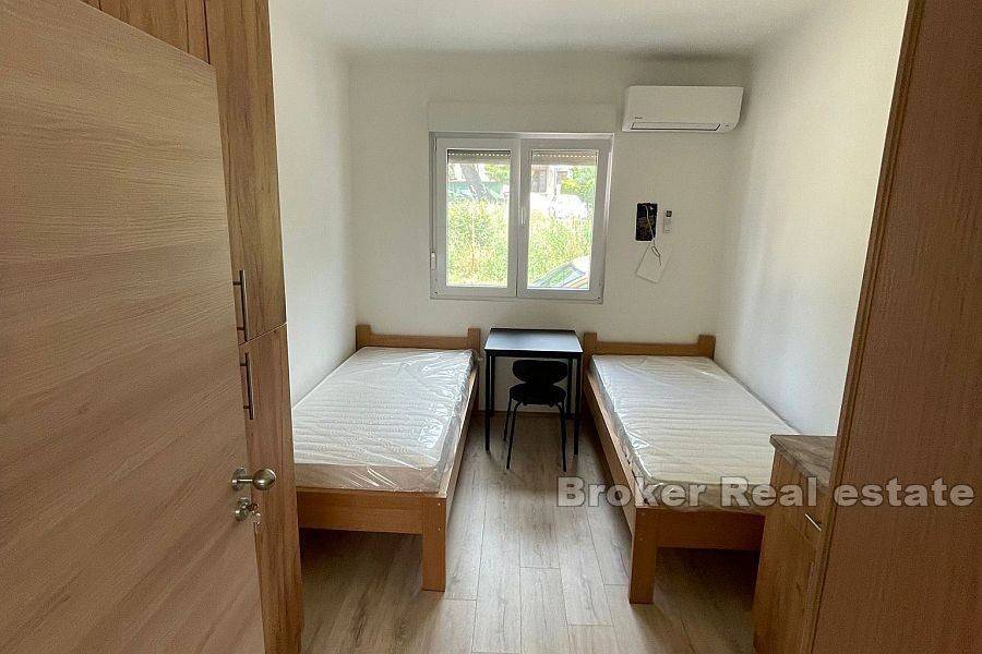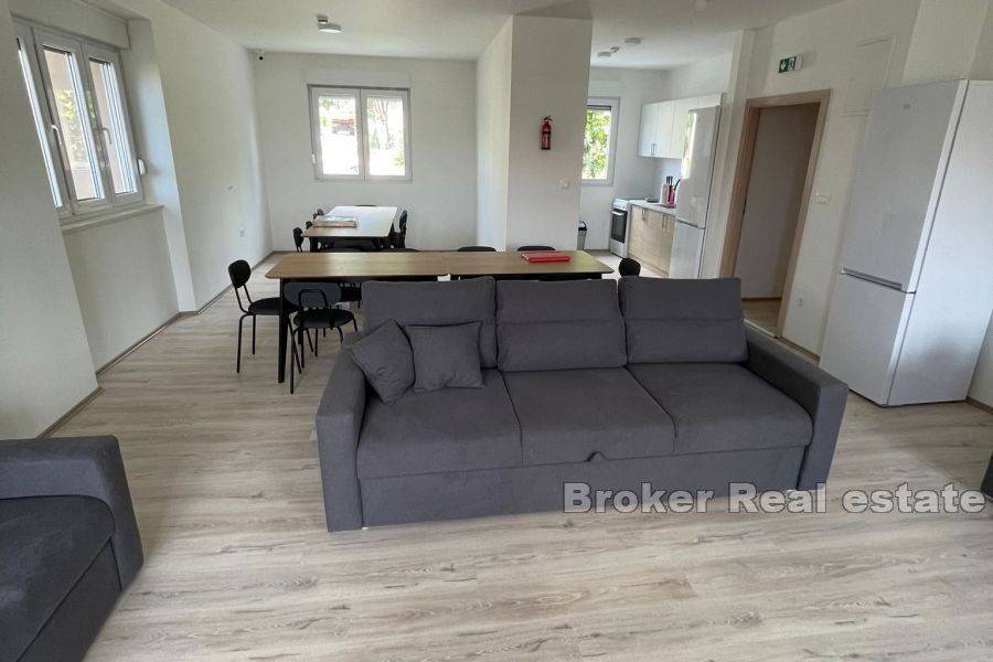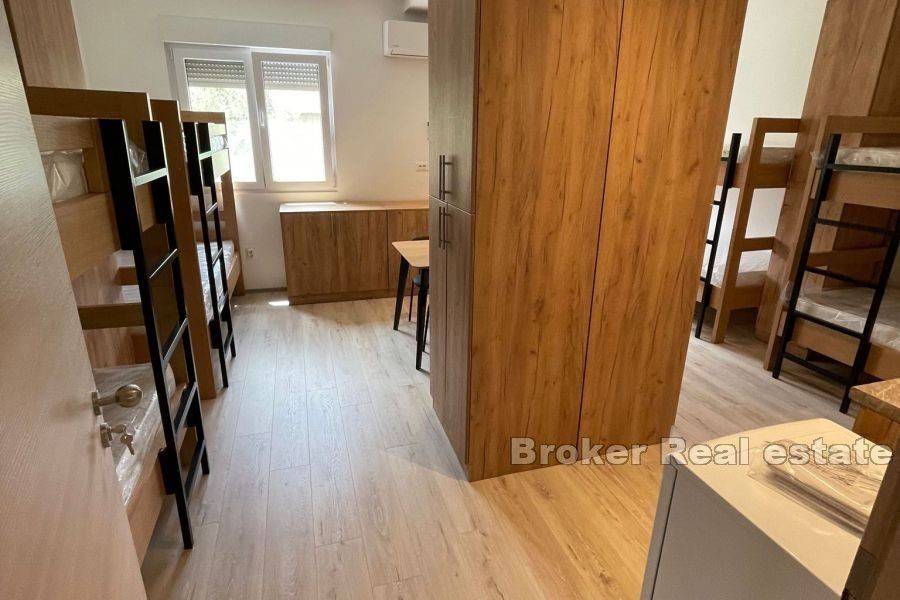 Hostel with seven rooms located on the ground floor of a residential and commercial building near the center of Kaštela. The area of the hostel is 350 m2 and it is fully furnished, and the last renovation was in 2023. Four bedrooms consist of eight beds, two rooms with two beds and one room with three beds. An attractive offer that offers the possibility of accommodation for employees or for tourist rental. VAT is not included in the hostel rental price. There is a possibility to rent a parking lot with 13 parking spaces located near the hostel. Close proximity to all the necessary facilities for living. The hostel can accommodate up to 13 people, the daily rent for one person is 150 €, there is a possibility of annual or seasonal rent, the price is negotiable.