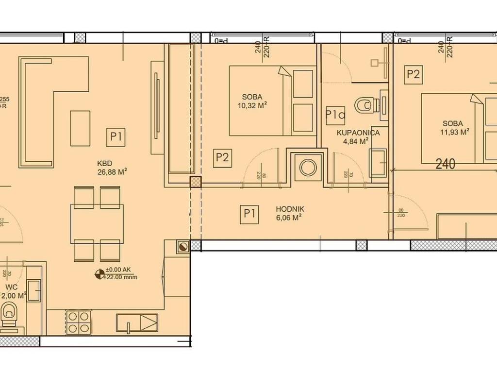 A two-bedroom apartment is for sale in a newly built building near Zadar. The building with a total of nine apartments is located on a plot of land located on elevated terrain with a gentle slope towards the sea, so almost every apartment has a sea view without interference from other properties. The apartment marked S1 is located on the ground floor of the building, and has a spacious garden and an outdoor parking space included in the price.It consists of a kitchen, dining room and living room, a hallway leading to two bedrooms, and a bathroom and a shared toilet. Ground floor apartments have a separate entrance that is not connected to the staircase, but is accessed via their own land and passage. Contact us for more available apartments in the building.