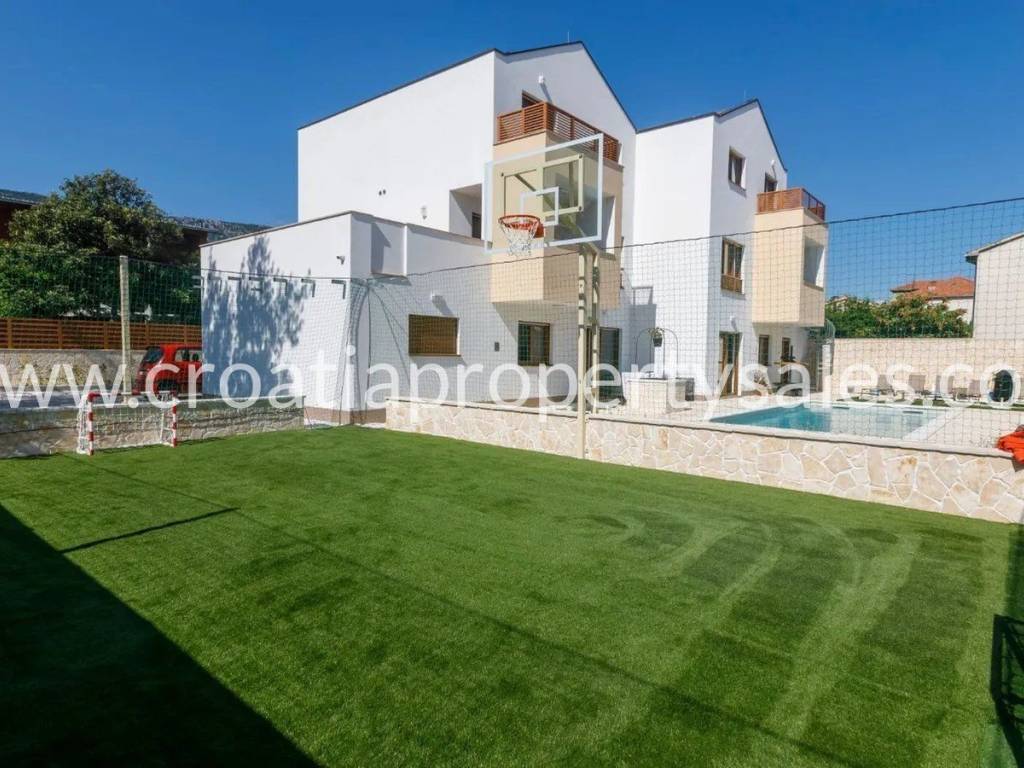 A luxury villa with a swimming pool located in Kaštela, in a unique location, offers the ideal combination of luxury, comfort and investment potential, and the sea view itself adds a special charm to this property.It is located on a plot of 712 m2, and the living area is 464 m2.It extends over 3 floors (ground floor, first floor and attic), and each floor is connected by an internal staircase.On the ground floor there is an apartment consisting of a kitchen with a dining room, a spacious living room, two bedrooms and one shared bathroom with a toilet.From the ground floor there is an exit to the courtyard where there is a swimming pool and a sunbathing area, and in the courtyard there is a gym, equipped with the most modern top-quality exercise equipment.For passionate sports fans, there is also a playground that offers the possibility of football and basketball games.On the first floor of the villa there are 3 large bedrooms with separate bathrooms, a large living room with a kitchen and dining room, a toilet and an open terrace with a sea view. On the last floor, in the attic, there are 3 bedrooms with bathrooms, and one room has its own balcony.Built with elegance and functionality, with the highest quality materials, this villa offers exactly what you need for relaxation and entertainment.It is located in a very quiet location, only 50 m from the sea, near beaches, a beautiful promenade and a medieval castle, which further enriches the stay there.The villa is equipped with underfloor heating and air conditioning.It is surrounded by a modern wooden fence, so it offers privacy and peace, and as a combination of luxury and functionality, it guarantees an unforgettable stay for its future users.