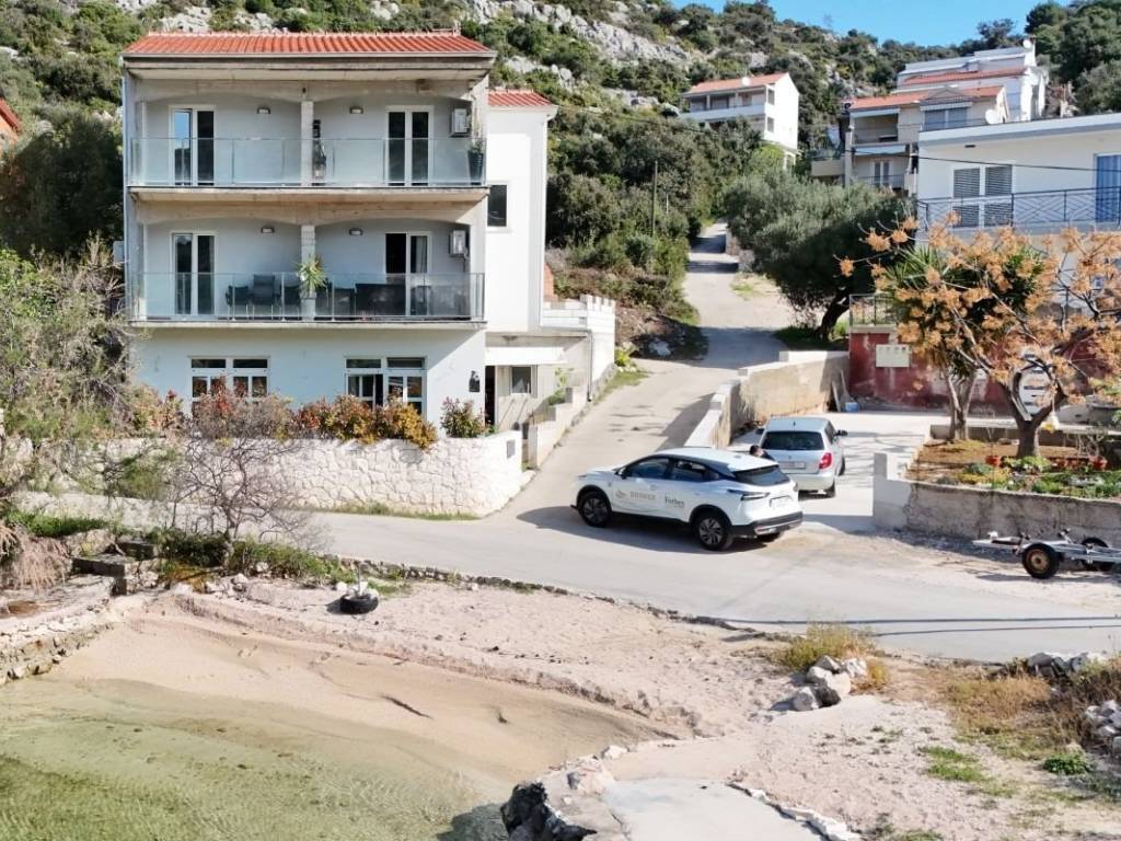 For sale is a three-story apartment house located directly on the beach in a peaceful bay near Rogoznica.   The house consists of 4 fully furnished and well-established one-bedroom apartments. Each apartment is south-facing and offers a sea view. The apartments are fully equipped and are being sold as such.   On the ground floor, there is a spacious area that requires renovation — it can serve as a playroom, a social gathering area, or be converted into a residential unit.   The property also includes a garage/storage space.   The total gross area of the property is 262 m².   The location of the property is exceptional — in a quiet bay, right on the beach, with beautiful views from every floor.   The house requires some renovation and completion of part of the façade and landscaping.   It is being sold fully furnished and equipped, and is ready to continue operating as a rental business.   It is possible to rent parking spaces (200€ per season).   The nearest grocery store is 1.6 km away, while restaurants and cafés are about 2 km away in the nearby village of Ražanj.   An ideal property for lovers of beachfront living, stunning sunsets, and peaceful summer getaways — but also an excellent investment opportunity given the popularity of the micro-location and the number of apartments.
