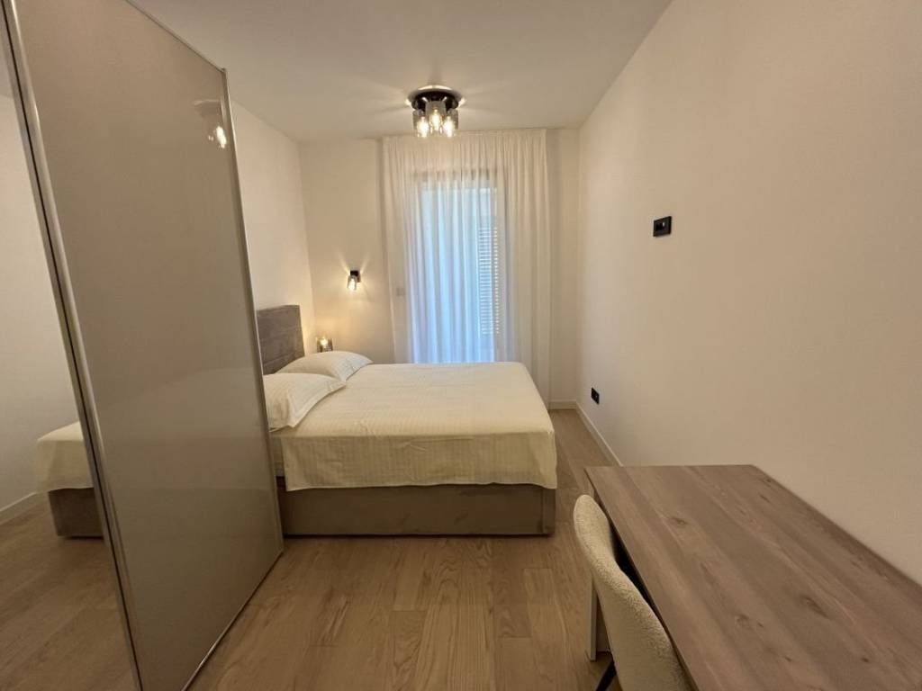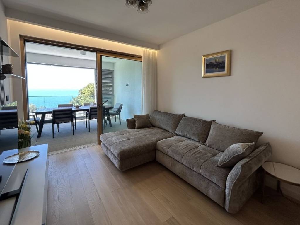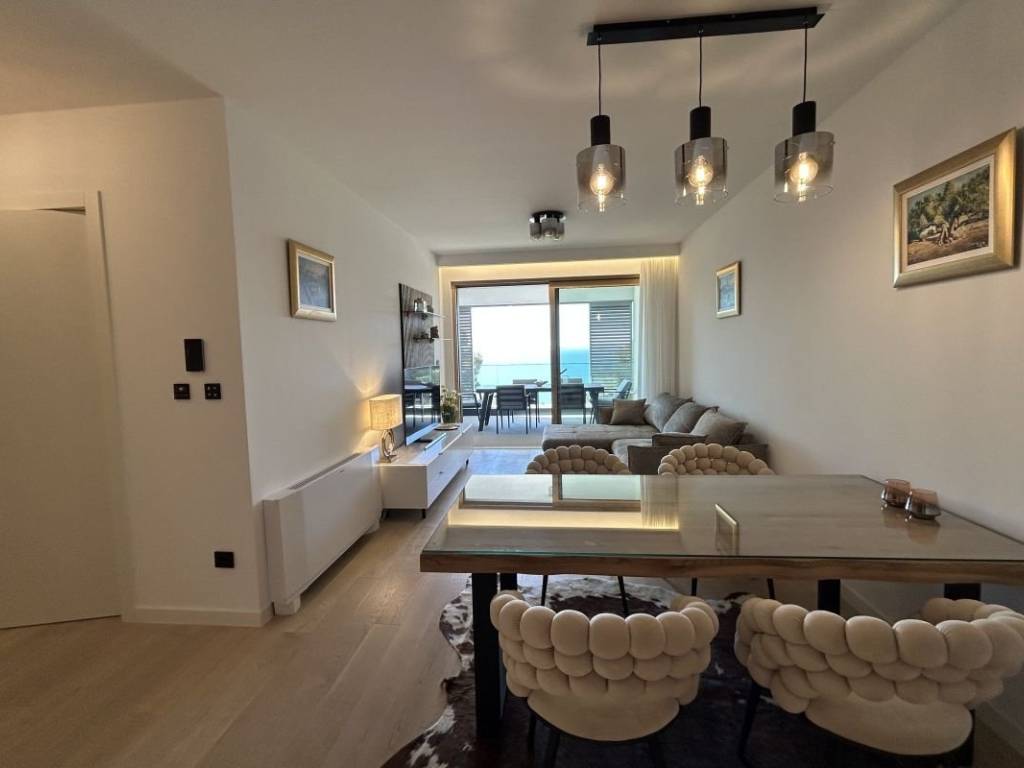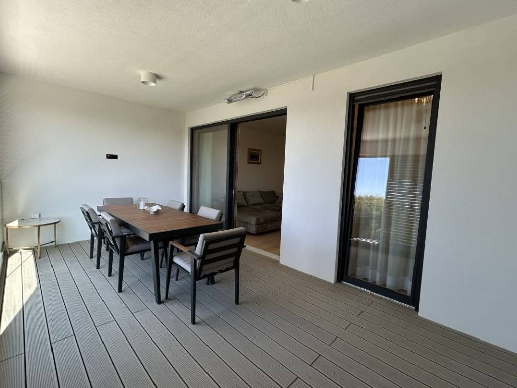 A fully furnished apartment on the 1st floor of a modern residential building with a reception and security guard is available for long-term rent in Duilovo. The apartment is 82 m2 in size, facing south, and consists of 2 air-conditioned bedrooms, both with double beds. One bedroom has its own bathroom, while the other has a desk and access to a loggia. The apartment is designed as follows: a kitchen with a dining room and a spacious living room with access to a loggia with an open view of the sea and islands. The rent includes a garage parking space and the use of the building’s facilities: sauna and gym.   The apartment is located in a very quiet location, and nearby are shops, schools and Žnjan beach.