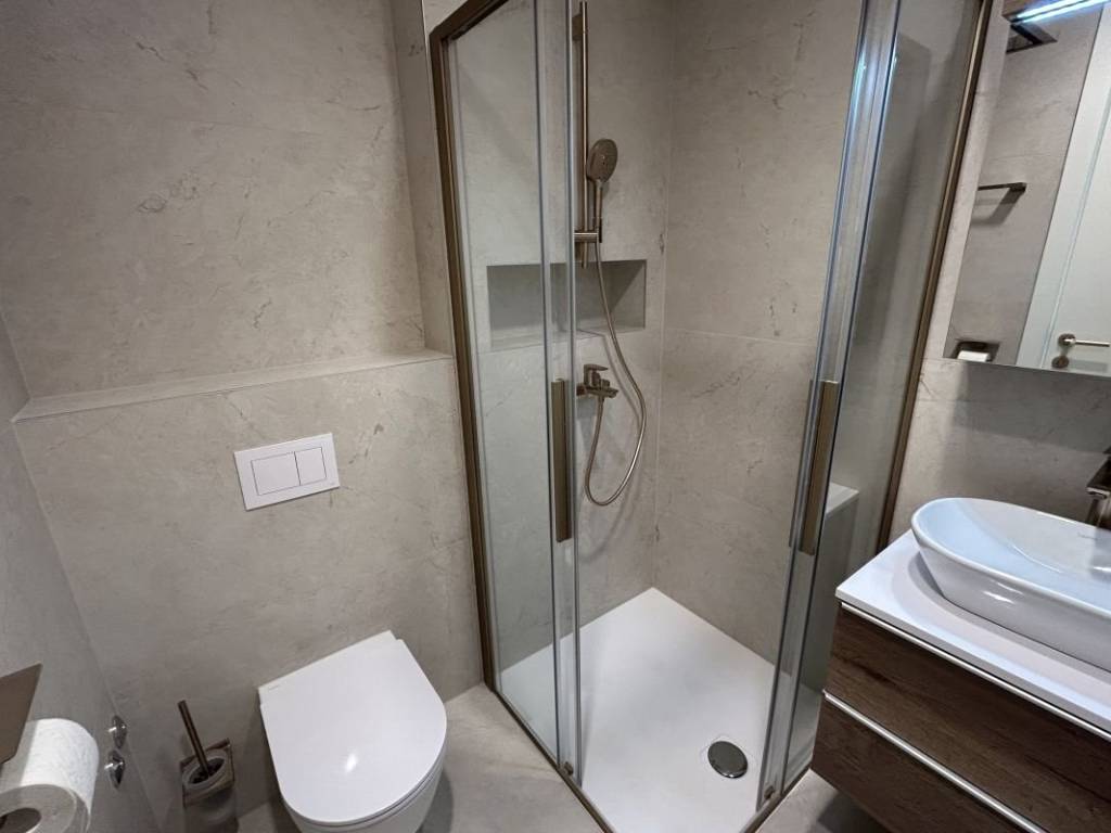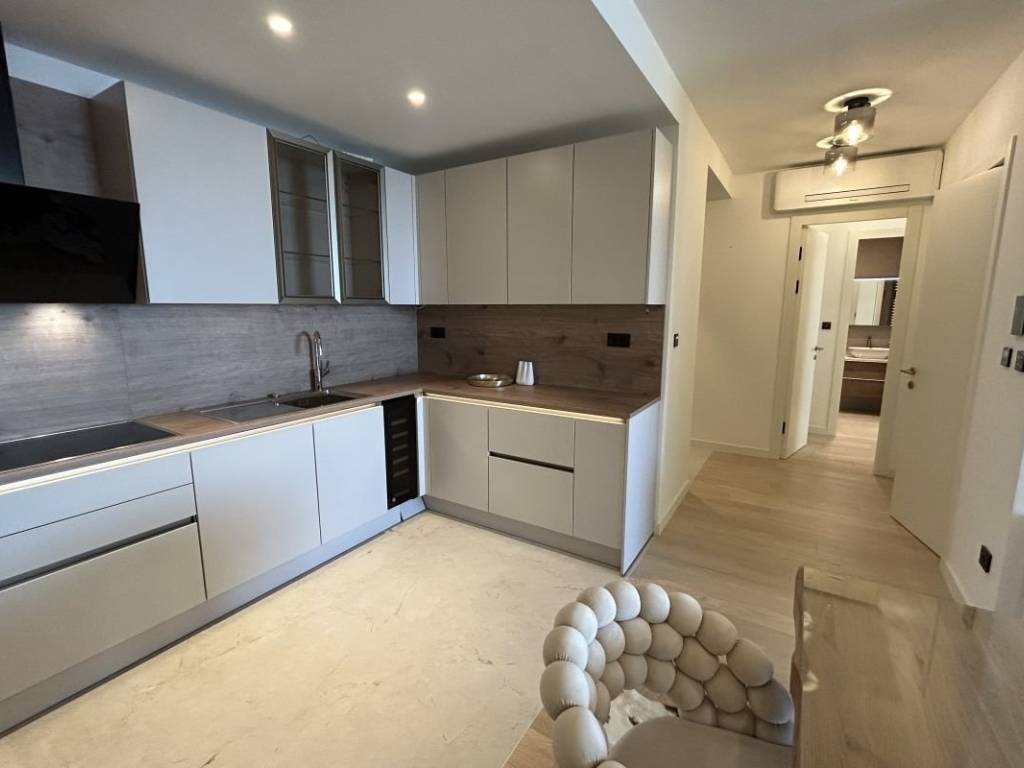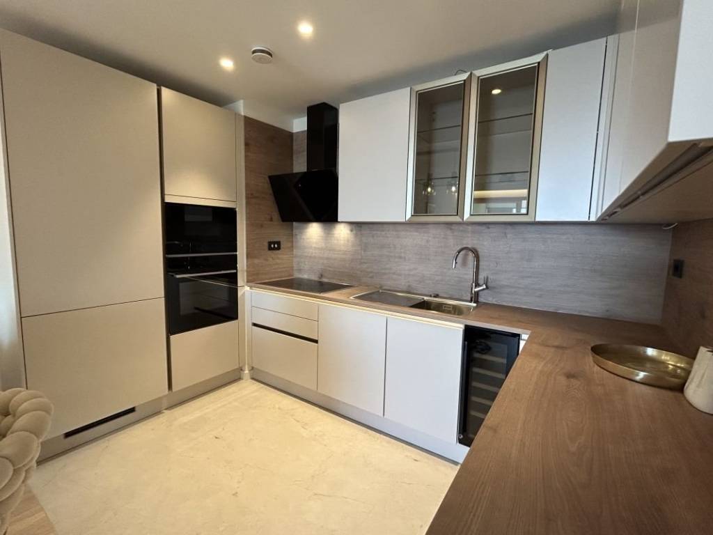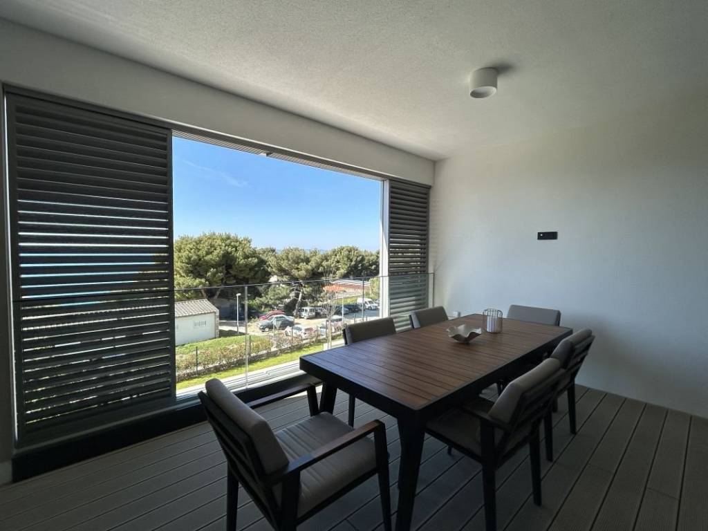 A fully furnished apartment on the 1st floor of a modern residential building with a reception and security guard is available for long-term rent in Duilovo. The apartment is 82 m2 in size, facing south, and consists of 2 air-conditioned bedrooms, both with double beds. One bedroom has its own bathroom, while the other has a desk and access to a loggia. The apartment is designed as follows: a kitchen with a dining room and a spacious living room with access to a loggia with an open view of the sea and islands. The rent includes a garage parking space and the use of the building’s facilities: sauna and gym.   The apartment is located in a very quiet location, and nearby are shops, schools and Žnjan beach.
