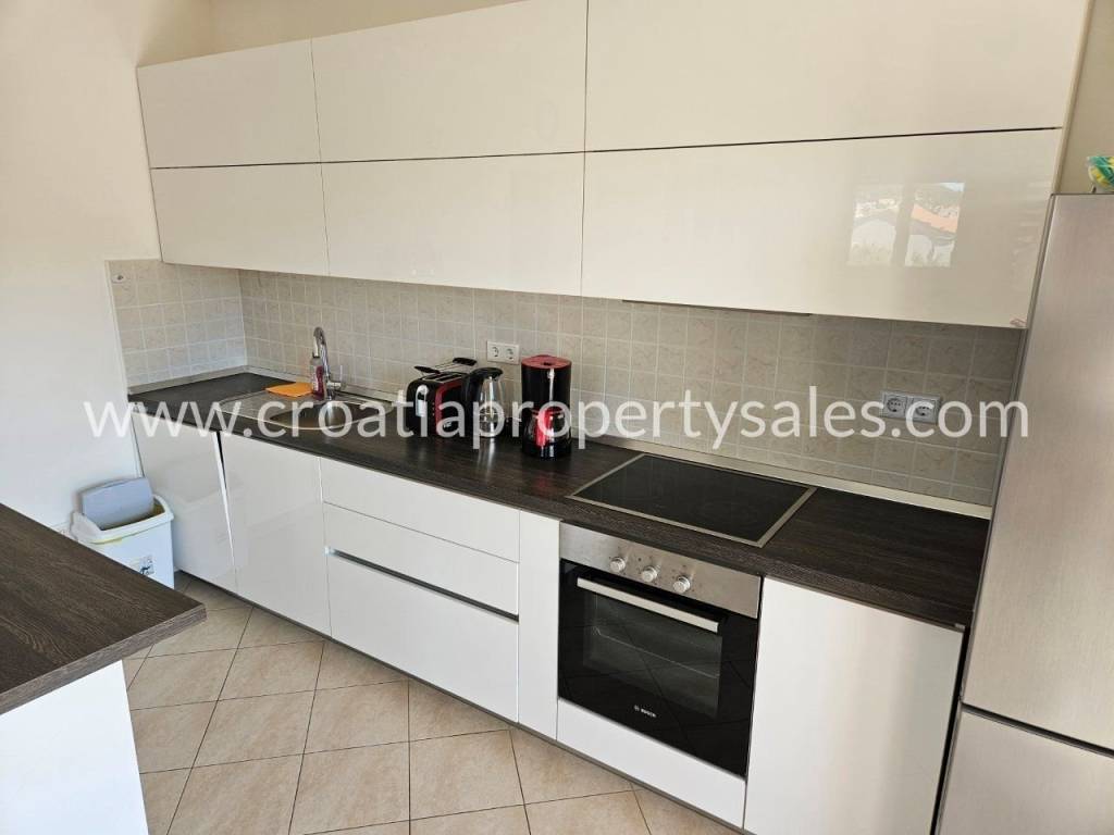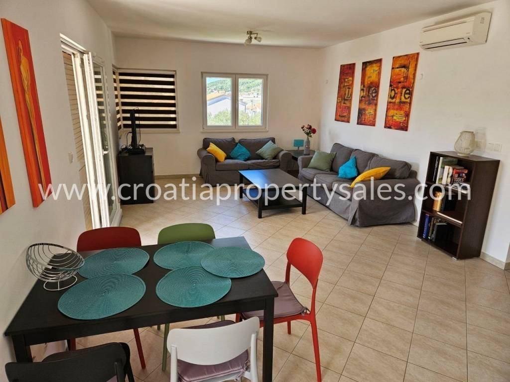 Looking for a nice family home or a good rental property?Well, look no further because we have something interesting in our offer. This is a 3-storey house located in Seget, not far from the sea and with nice sea views.  Current owners have bought this house in 2013 and have fully renovated it in 2016 and have made some changes to it. The house consists of 3 modern and spacious apartments, basically with the same layout on all 3 floors. The only difference is that the 1st and 2nd floor have an additional guest toilet. Ground floor apartment consists of 2 bedrooms, 1 bathroom, kitchen and living room area, with a nice terrace that has a partial sea view. Apartments on the 1st and 2nd floor have 2 bedrooms, 1 bathroom and 1 guest toilet, open space concept of living room and kitchen, also with spacious balconies, that offer even better sea views. Size of the apartment on the ground floor is 83 m2, including the outdoor terrace of 23 m2, while the apartment on the 1st and 2nd floor have a total of 86 m2, with the same size of balconies of 23 m2. In front of the house is a paved yard for parking, while on the back side of the house is a small area with a BBQ and an outdoor storage unit. This house is located in a nice area, just 500 m from the sea and small center of Seget. It is ready to move in sold fully furnished. A good rental business can be established, but it can also be a property for a larger family since all 3 apartments have separated entrances, which gives more privacy and space.