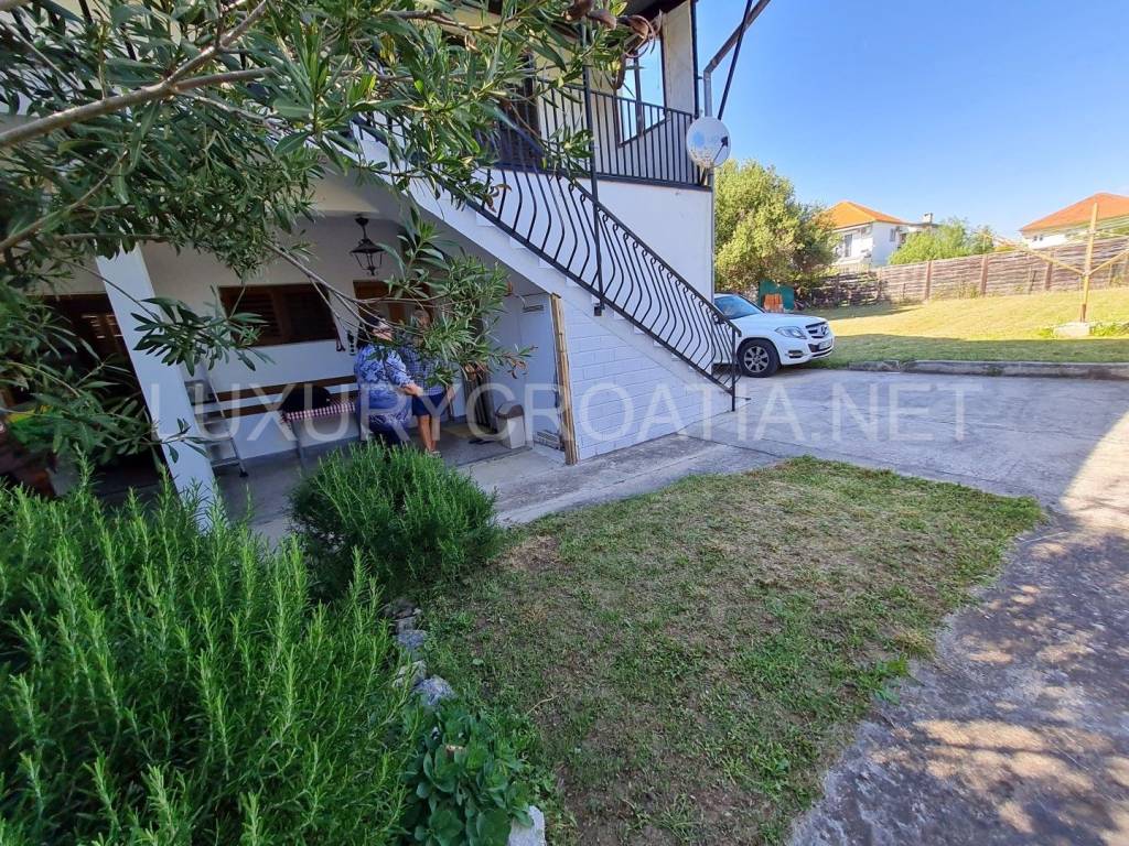 House consists of 6 apartments. House is semi-detached and has 1136 square meters of land, so it is possible to construct another house, or even small boutique hotel, or building with flats for sale or for rent. There is direct car access from the beach to the house. There is a large parking space for at least 8 cars and garden covered in grass and fruit trees (figs, cherry, and olives) that make shade in summer, so it is relaxing to be in the garden or have lunch in the shade, only 50 meters from the beach with direct private access to the beach. It is a very romantic atmosphere.