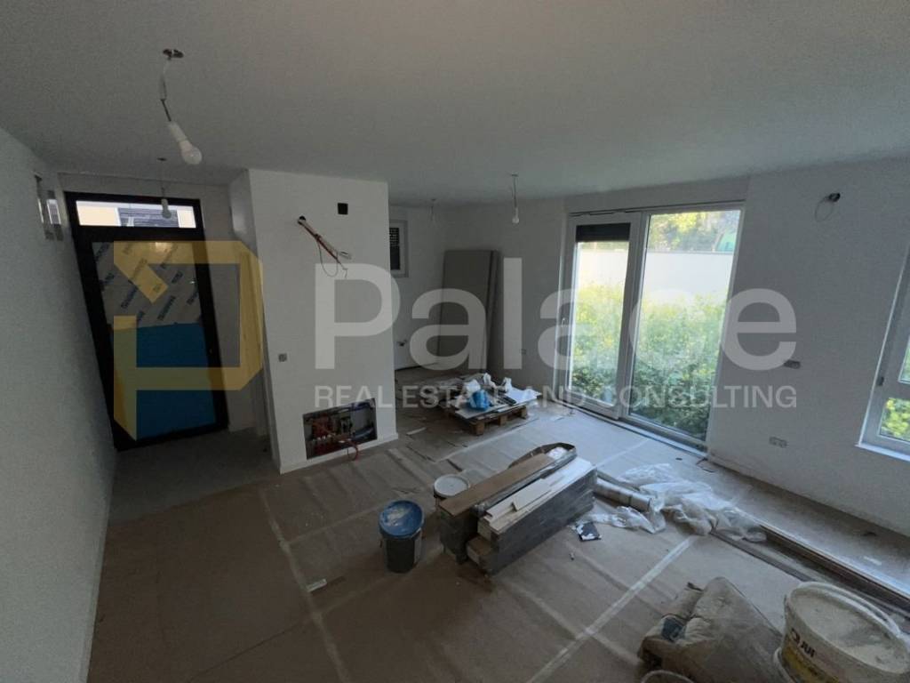 The ground floor of the apartment is in an open space layout, with a large living room with kitchen and dining area, a toilet with a sink, and access to the garden.