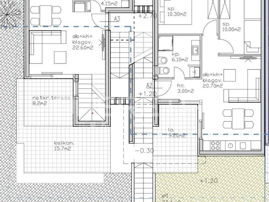 The apartment has a loggia of 9.20 m2, a garden of 23.10 m2, a storage room on the ground floor of the building of 7.10 m2 and a covered parking space of 12.25 m2.