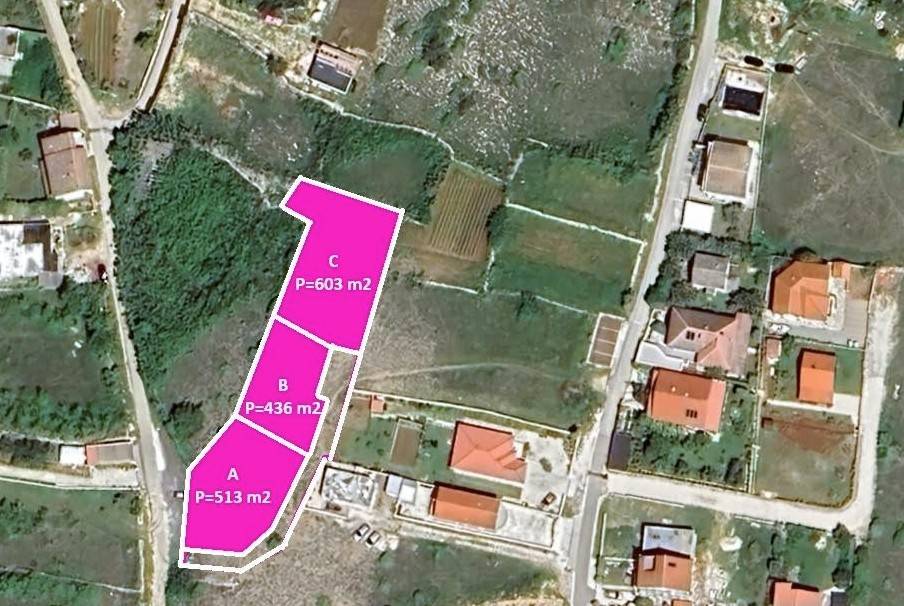 Prodaje se građevinsko zemljište u Ražancu, Zadarska županija površine površine 603 m2. Radi se o zemljištu koje ima ukupno 1947 m2, ali je u procesu parcelacija na tri manja zemljišta, skica u privitku. A= 513 m2, cijena 80 000 eura. B= 436 m2, cijena 68 000 eura C=613 m2, cijena 92 500 eura. Prilaz je s asfaltirane ceste. Struja i voda su u blizini. Pogled na more i Velebit. Udaljenost do mora je 600-700 m. Vlasništvo uredno.