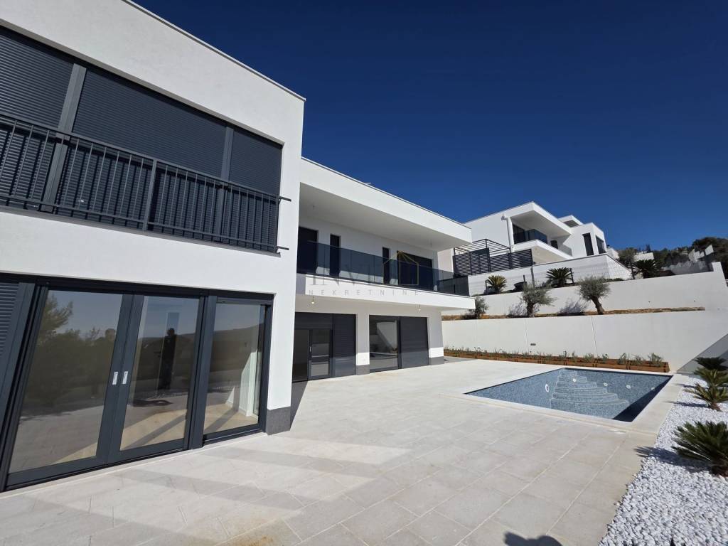 A modern, newly built villa from 2025 is for sale, located in a quiet location in Vinišće with an open panoramic view of the sea. The villa has a living area of 200 m² and is located on a plot of 540 m². It consists of four spacious bedrooms and five fully equipped bathrooms. All bathrooms, as well as the kitchen and living room, have underfloor heating, while all rooms are air-conditioned with Mitsubishi air conditioners. The property is under video surveillance, and in the yard there is a swimming pool measuring 8 x 3.7 meters, with preparation for an outdoor shower and an outdoor kitchen. The 100 m² natural stone terrace is ideal for relaxing and socializing, and an additional storage room in the yard provides additional functionality. The house is built with high-quality thermal insulation (10 cm of polystyrene), which ensures energy efficiency and comfort throughout the year. This property is an ideal choice for family life, a luxury vacation or as an investment in a tourist rental.