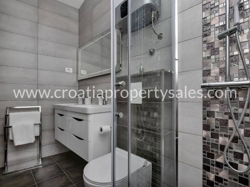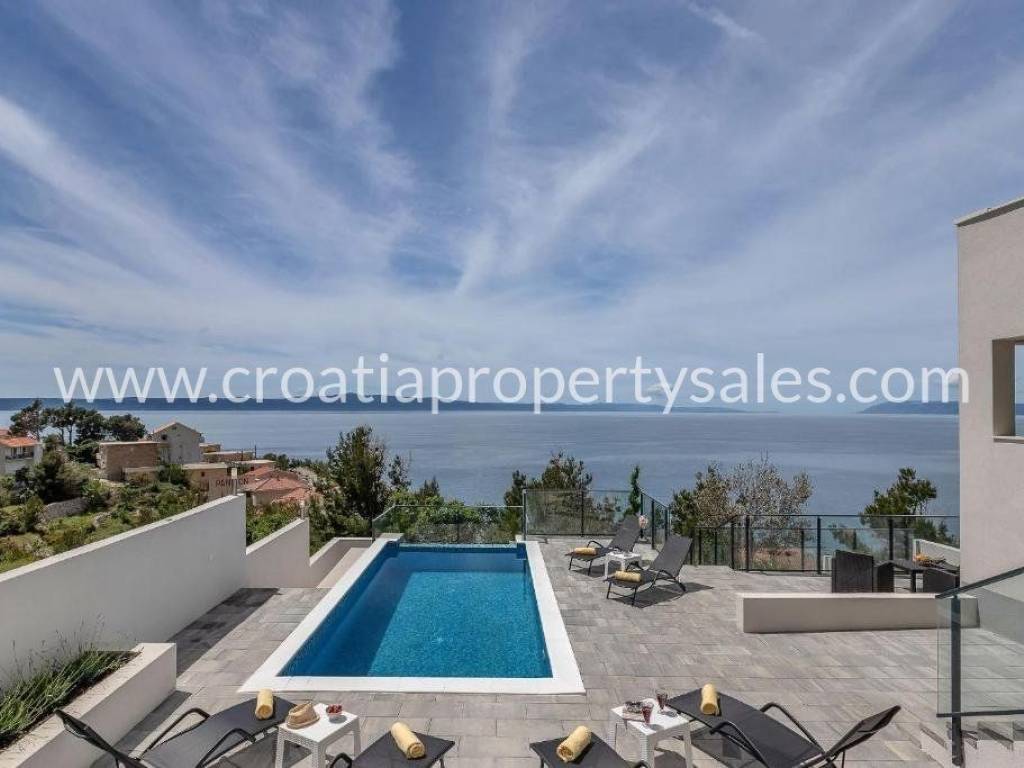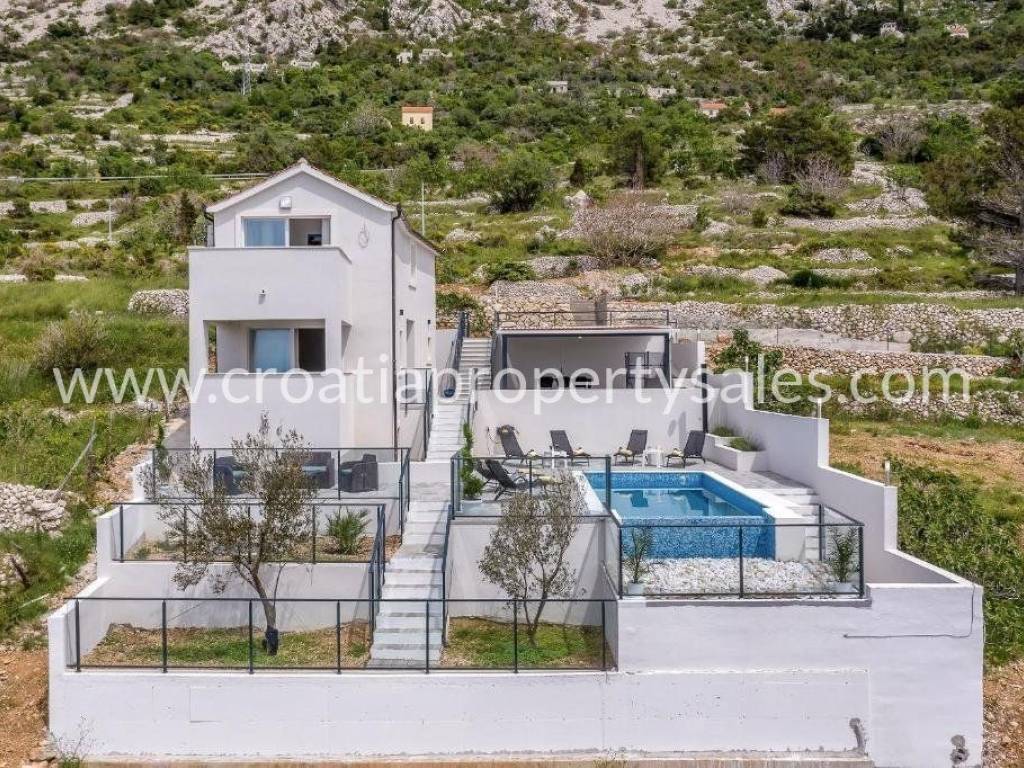 Villa with a swimming pool and panoramic views located in a quiet location ideal for a summer vacation.This exceptional villa is located 350 m from the sea and the beautiful pebble beaches for which the Makarska Riviera is famous.It consists of two bedrooms, 2 bathrooms, a kitchen, a dining room and a living room that have access to a beautiful outdoor terrace with a swimming pool and a summer kitchen.The property is sold fully furnished and equipped and with an established tourist rental that can be an additional source of income for the future user.