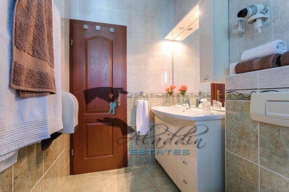 Three-star hotel in Seget Vranjica, in a central position, very close to the beach and featuring beautiful view of the sea and Trogir bay from all levels. It extends over 5 floors with a total living area of 1,144 square meters and land area of 520 square meters. In the partially subterranean floor lies a comfortable garage for 6 vehicles, water tank, fuel tank, engine room, boiler room, utility kitchen, two staff toilets, staircase and access area for delivery vehicle.
