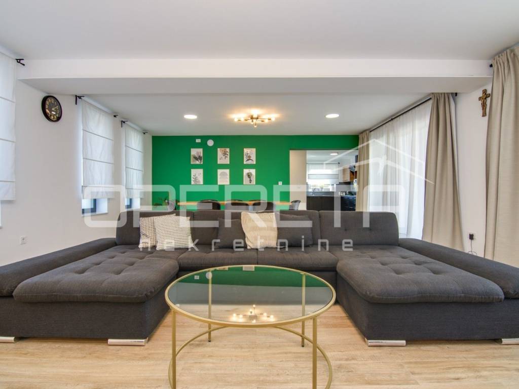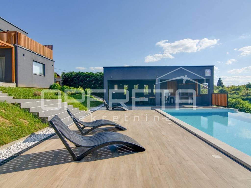 Kuća je idealna za turistički najam, organizaciju proslava, eventa, djevojačkih i momačkih večeri, ali zbog izvrsnog rasporeda može biti i obiteljska kuća na par minuta pješice od bitnijih sadržaja za život(dućani, vrtić...). Prostrani interijer moderno uređen, hortikulturno uređeno dvorište sa otvorenim veeelikim pogledom u daljinu, pruža udobnost i eleganciju, vanjski prostor s bazenom poziva na opuštanje i uživanje u sunčanim danima stvarajući nezaboravne uspomene. PREPORUČUJEMO!!!