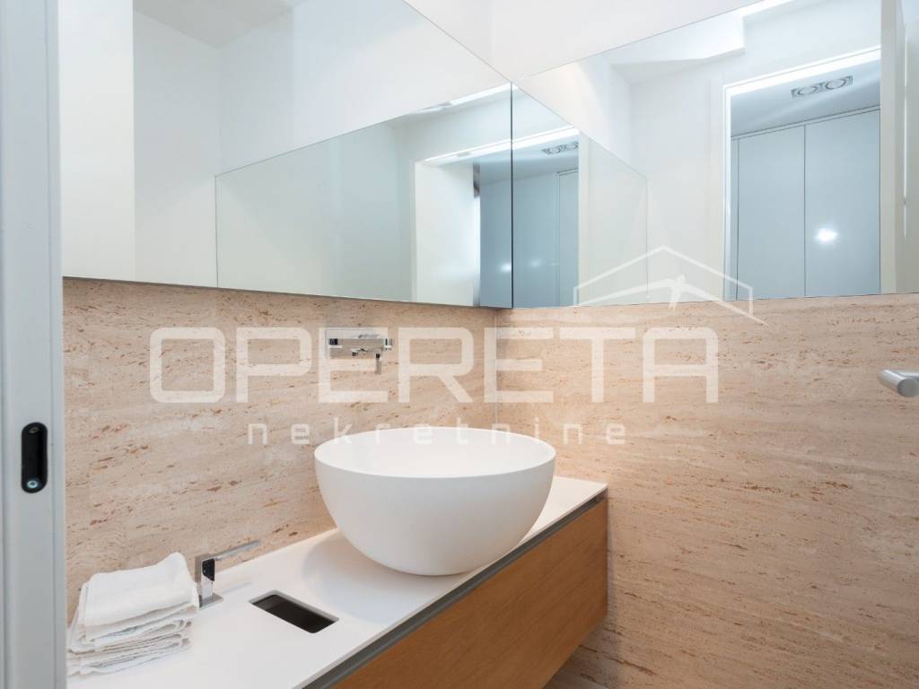 Obilježje cijelog stana je raskošni kamen travertin koji se proteže od ulaznog prostora, kroz sve kupaonice, stepenište i kuhinju.