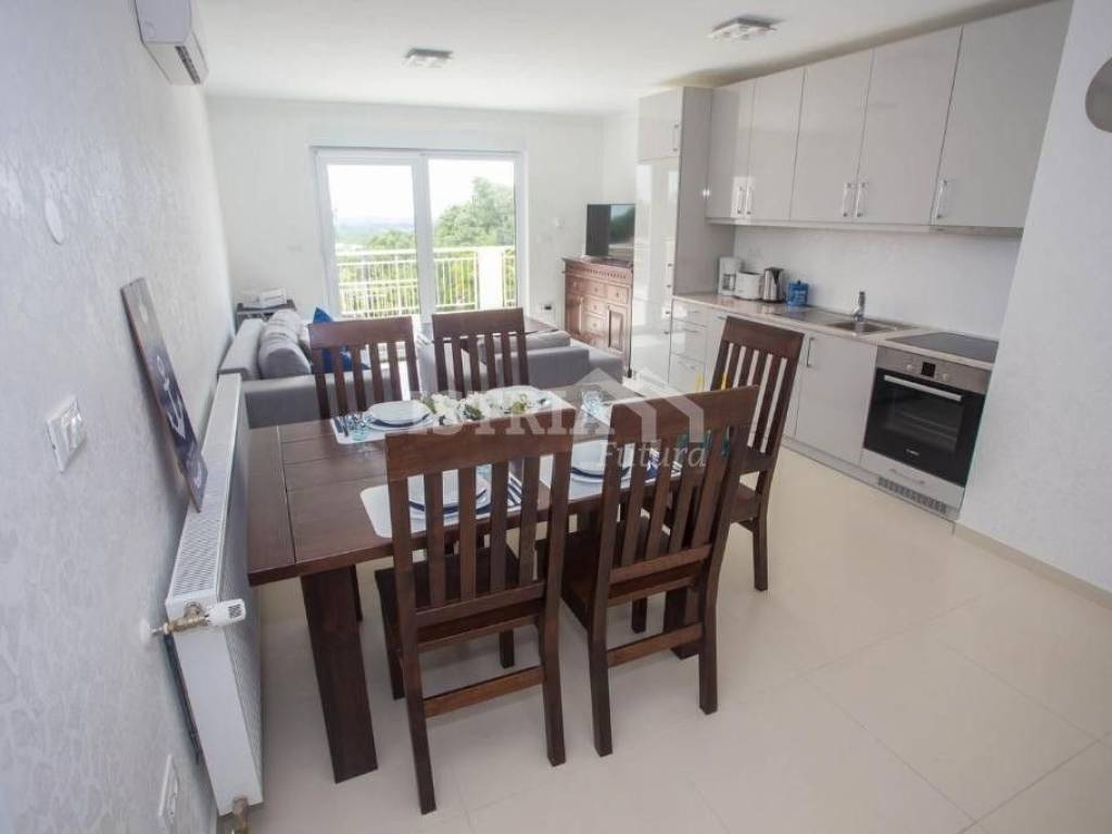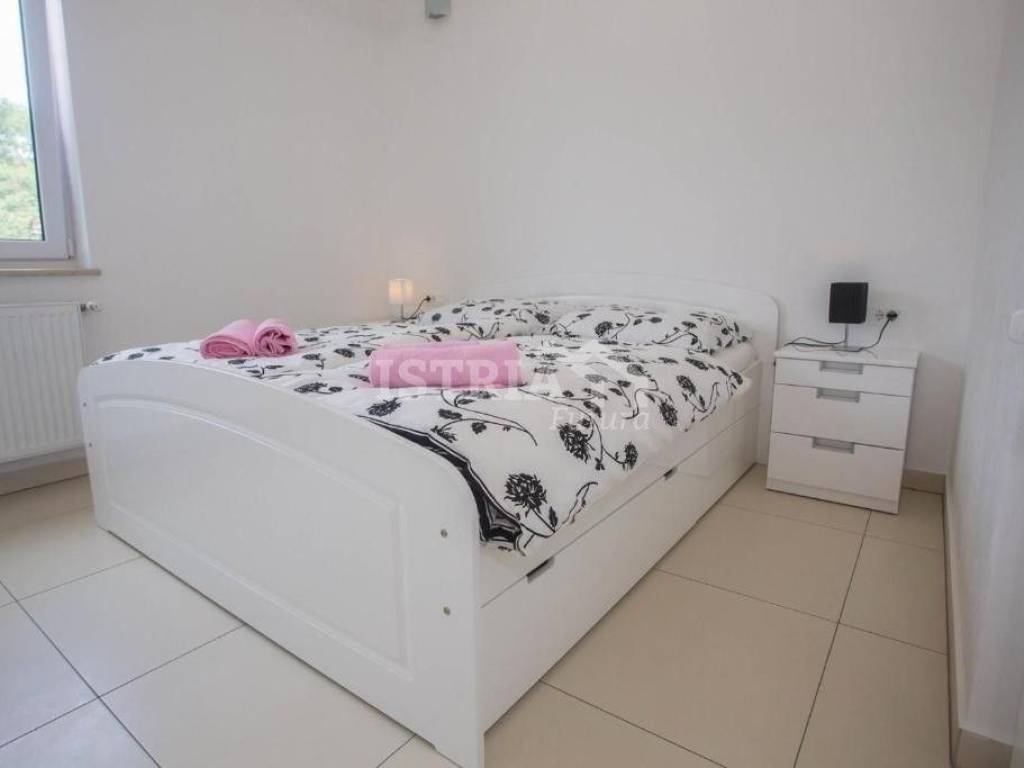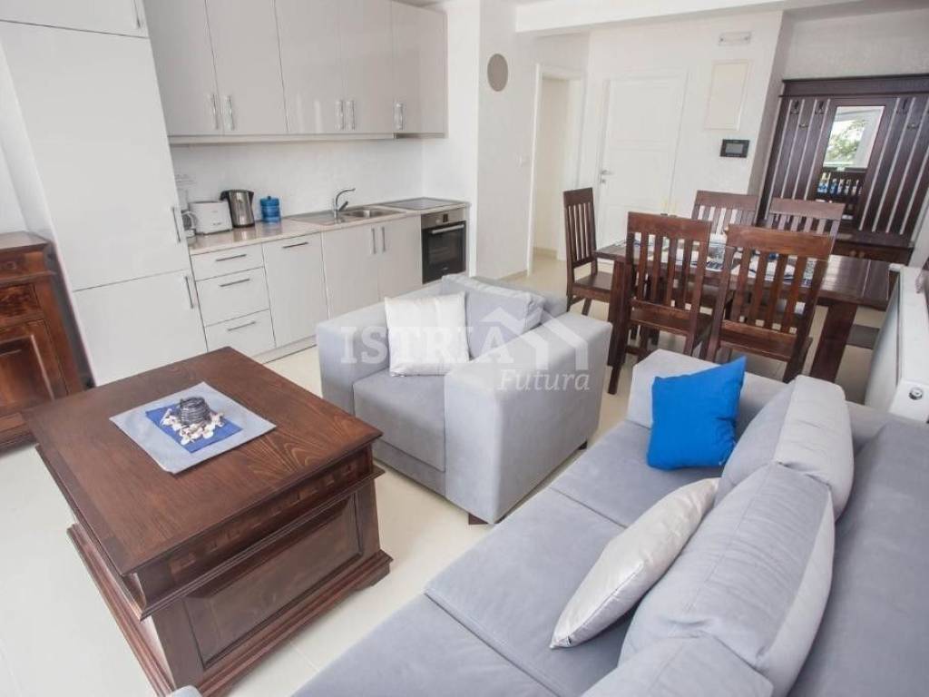 The larger apartment of 75 m2 consists of a living room with a kitchen and dining room, two bedrooms, two bathrooms, a toilet and a terrace with access to a landscaped yard with a swimming pool and a beautiful stone fireplace.