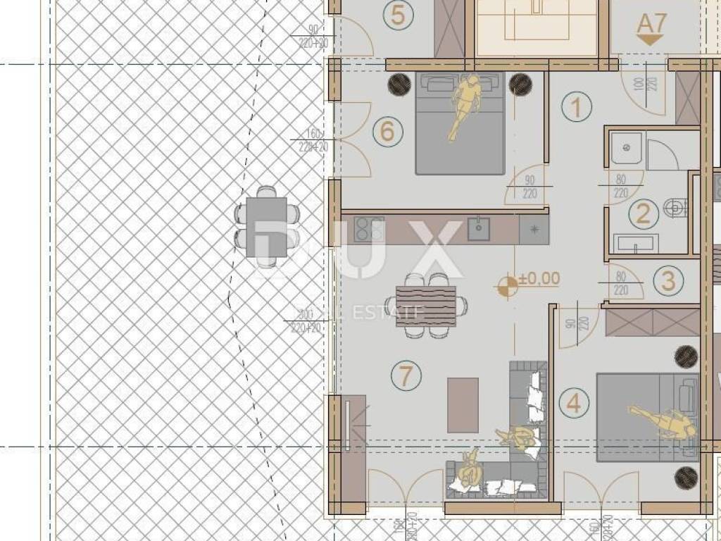 ISTRIA, PULA - A unique location by the sea! We present this high-quality and newly decorated apartment, located in one of the most famous locations in the city of Pula, the Stoja neighborhood. This apartment offers its future owners everything they need for a safe and peaceful family life, as well as everything they need for a secure return on investment through tourist rent. The apartment is thus located just 1 minute walk from all the amenities needed for a year-round stay, while there are also numerous additional amenities, such as natural and landscaped beaches, numerous promenades, parks, restaurants and others. APARTMENT DESCRIPTION: The apartment consists of a total of 94.07 m2 of living and reduced space, which is located on the ground floor of a fantastic residential building. Upon entering the apartment, you will be greeted by an entrance hall with a wardrobe, which leads to a spacious living room with kitchen and dining area. The apartment has two bedrooms, a bathroom and a storage room. One of the special features of this property is an 80m2 covered terrace and a garage parking space that is not included in the square footage of the apartment. The distance from the beautiful beach is only 170 meters. ADDITIONAL INFORMATION: * The ownership of the apartment is neat, the owner is 1/1, the building has all the necessary documentation, the possibility of buying on credit. * The apartment is sold furnished, without the owner's private belongings. * High-quality PVC joinery and quality materials have been installed * The apartment is in perfect condition * garage space LOCATION DESCRIPTION: The apartment is located in a newer and fantastic building located close to all the amenities necessary for a safe and peaceful year-round life. So, just 1 minute walk from the apartment there are numerous shops, schools, private and state kindergartens, cafes and bakeries. In addition, the apartment is located in an attractive location surrounded by numerous parks, green fields and gentle woods ideal for walks, we must not forget to mention that one of the most famous Pula beaches and promenades is close to the apartment. For any additional questions, necessary information or if you wish to organize a viewing appointment for the apartment and its location, feel free to contact us at any time. Dear clients, the agency commission is charged in accordance with the General Business Conditions: www.dux-nekretnine.hr/opci-uvjeti-poslovanja ID CODE: 39928 Deniro Osmanović Agent pripravnik Mob: +385 99 371 3802 Tel: +385 99 640 8438 E-mail: deniro@dux-istra.com www.dux-istra.com Aldin Begić Agent pripravnik Mob: +385 95 391 9185 Tel: +385 99 640 8438 E-mail: aldin@dux-istra.com www.dux-istra.com