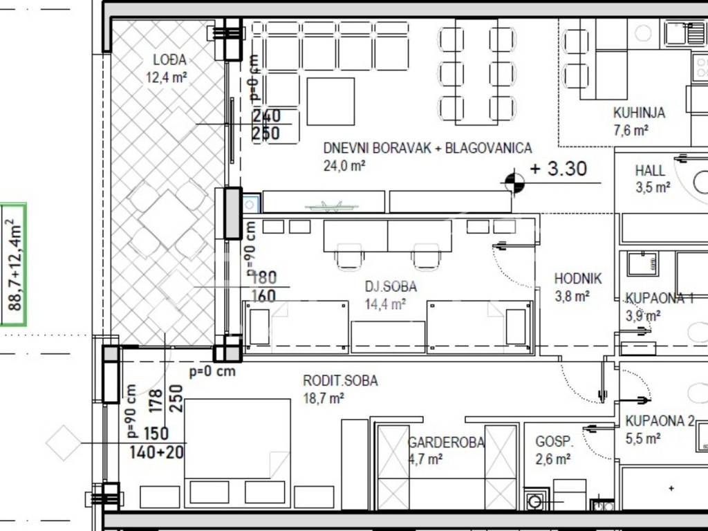 Prodaje se stan površine 88,7 m2 s lođom površine 12,4 m2 na 1. katu niskoenergetske stambeno – poslovne zgrade na odličnoj lokaciji. Zgrada se sastoji od podruma, visokog prizemlja, prvog, drugog i trećeg kata te sadrži ukupno 74 stambene jedinice i 7 poslovnih prostora. Završetak gradnje predviđen je krajem 2025./početak 2026. Energetski razred je A+. Moguć je odabir podnih obloga (keramika, parket ili laminat) te odabir unutarnje stolarije. Uz stan moguća je kupovina i vanjskog parkirnog mjesta po cijeni od 8.000,00 EUR, garažnog mjesta bez spremišta po cijeni od 14.000,00 EUR, garažnog mjesta sa spremištem do 17,4 m2 po cijeni od 17.500,00 EUR, garažnog mjesta sa spremištem do 19,4 m2 po cijeni od 19.500,00 EUR ili garažnog mjesta sa spremištem do 20,6 m2 po cijeni od 22.500,00 EUR.