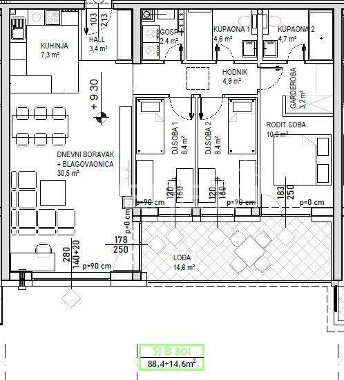Prodaje se stan površine 88,4 m2 s lođom površine 14,6 m2 na 3. katu niskoenergetske stambeno – poslovne zgrade na odličnoj lokaciji. Zgrada se sastoji od podruma, visokog prizemlja, prvog, drugog i trećeg kata te sadrži ukupno 74 stambene jedinice i 7 poslovnih prostora. Završetak gradnje predviđen je krajem 2025./početak 2026. Energetski razred je A+. Moguć je odabir podnih obloga (keramika, parket ili laminat) te odabir unutarnje stolarije. Uz stan moguća je kupovina i vanjskog parkirnog mjesta po cijeni od 8.000,00 EUR, garažnog mjesta bez spremišta po cijeni od 14.000,00 EUR, garažnog mjesta sa spremištem do 17,4 m2 po cijeni od 17.500,00 EUR, garažnog mjesta sa spremištem do 19,4 m2 po cijeni od 19.500,00 EUR ili garažnog mjesta sa spremištem do 20,6 m2 po cijeni od 22.500,00 EUR.