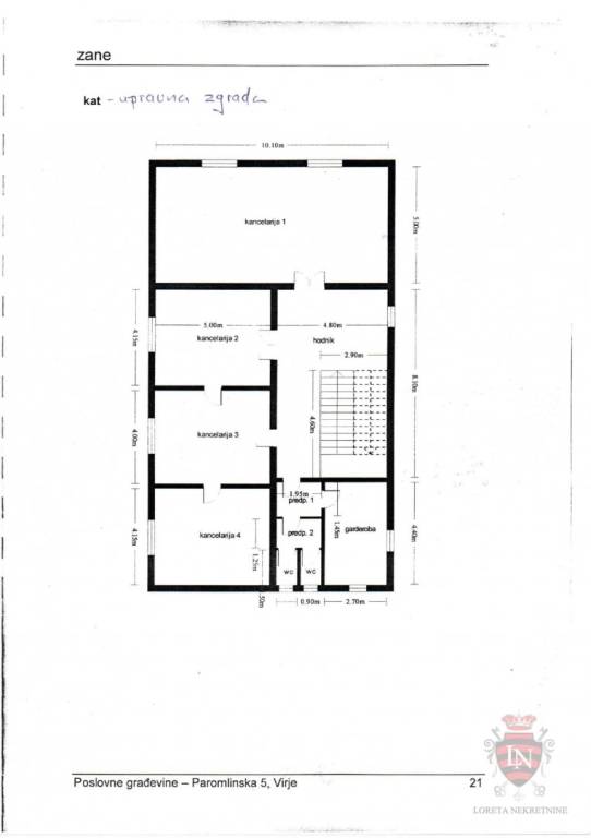 The administrative building consists of a basement, ground floor and 1st floor. On the ground floor there are 5 office rooms, kitchen and toilet (sink and toilet), and a hallway. On the first floor there are three rooms suitable for offices, a complete bathroom and a hallway. There is also a larger room that used to be used as a classroom, and is currently used as a living room, i.e. the complete floor has been converted into an apartment.