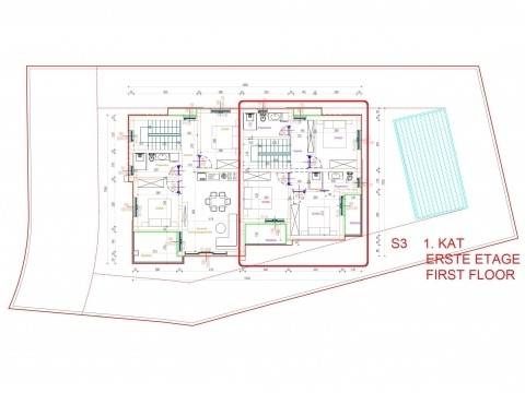 The first floor of 59.57 m2 has 3 bedrooms, 2 bathrooms, hallway and 2 terraces.