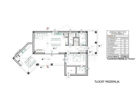 This villa consists of a ground floor and a first floor, with a total net area of 166.93 m2. Upon entering the house, we enter the hall, where on the right is a bathroom, a staircase to the first floor and a storage room, and on the right is a bedroom with its own bathroom. Then you get to the open unit with the kitchen, dining room and living room, which have an open view of the garden and the pool. From the outside of the ground floor, you enter another storage room planned as an engine room for the pool and central heating. On the first floor there are two bedrooms with their own bathrooms.