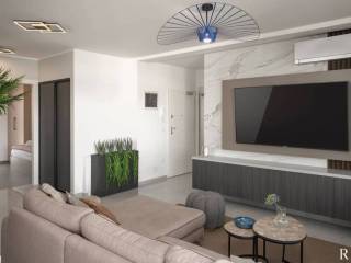 The spacious open space living area includes an elegant living room with a large smart TV, a modern kitchen with an island and a fully equipped dining area.