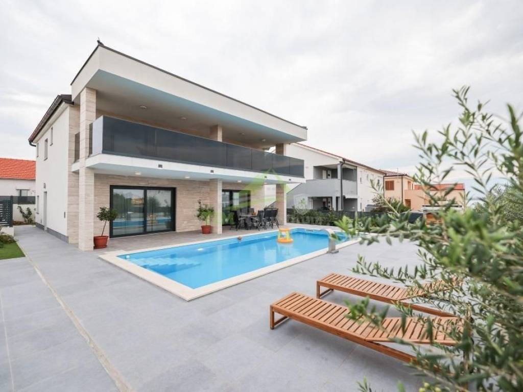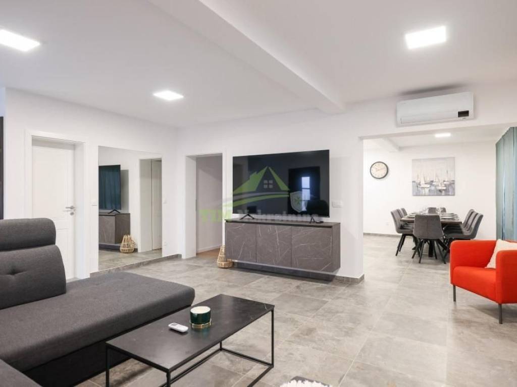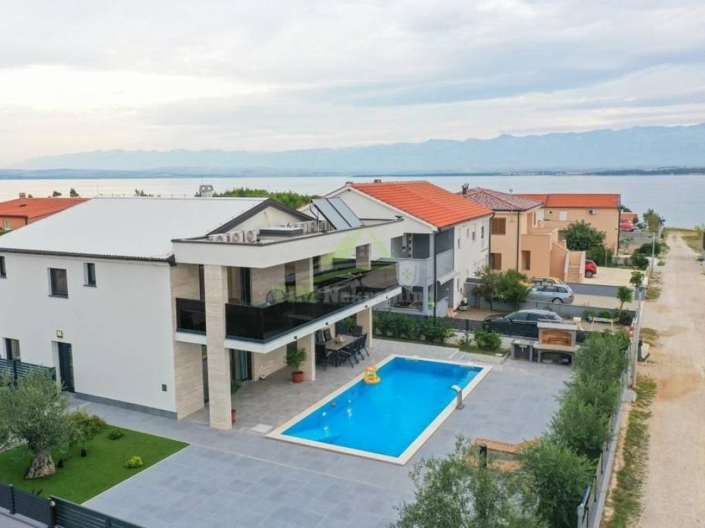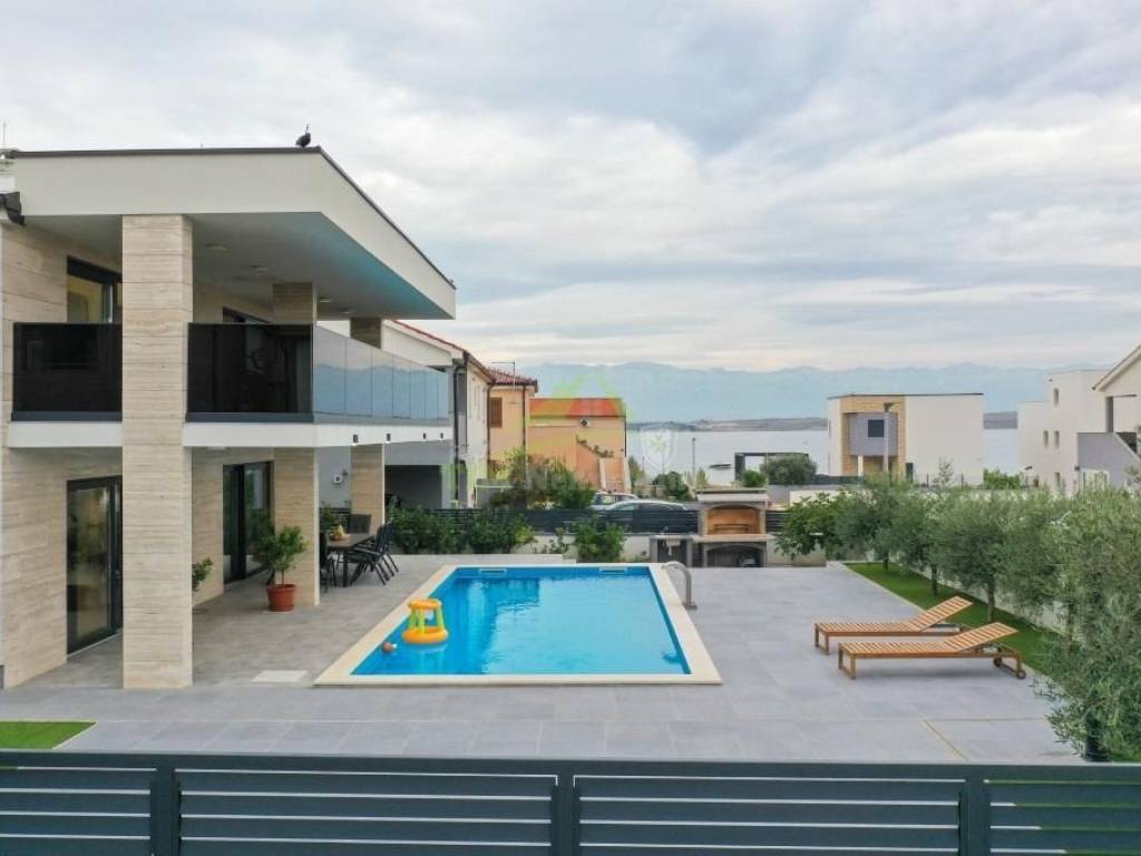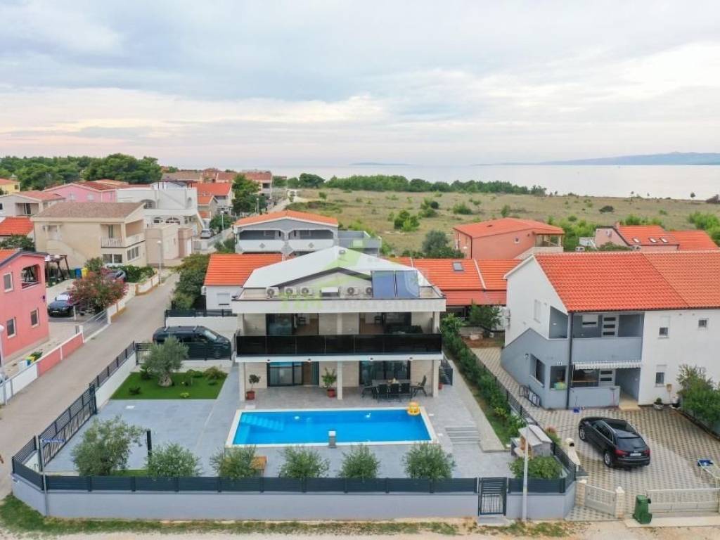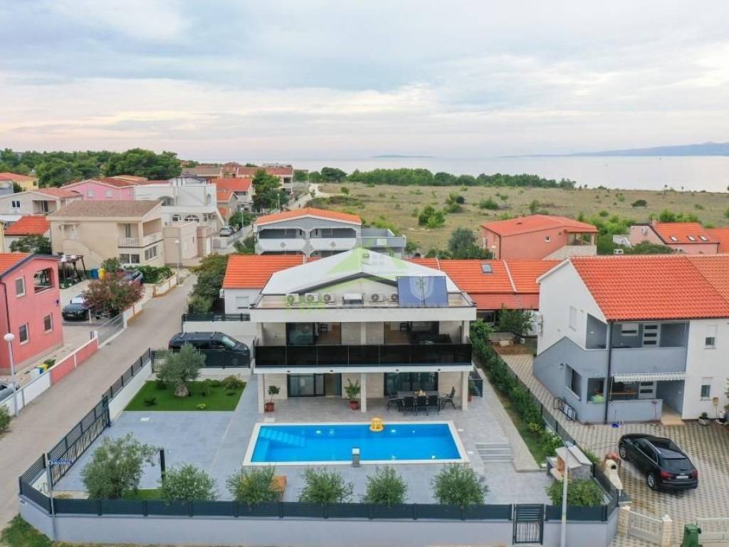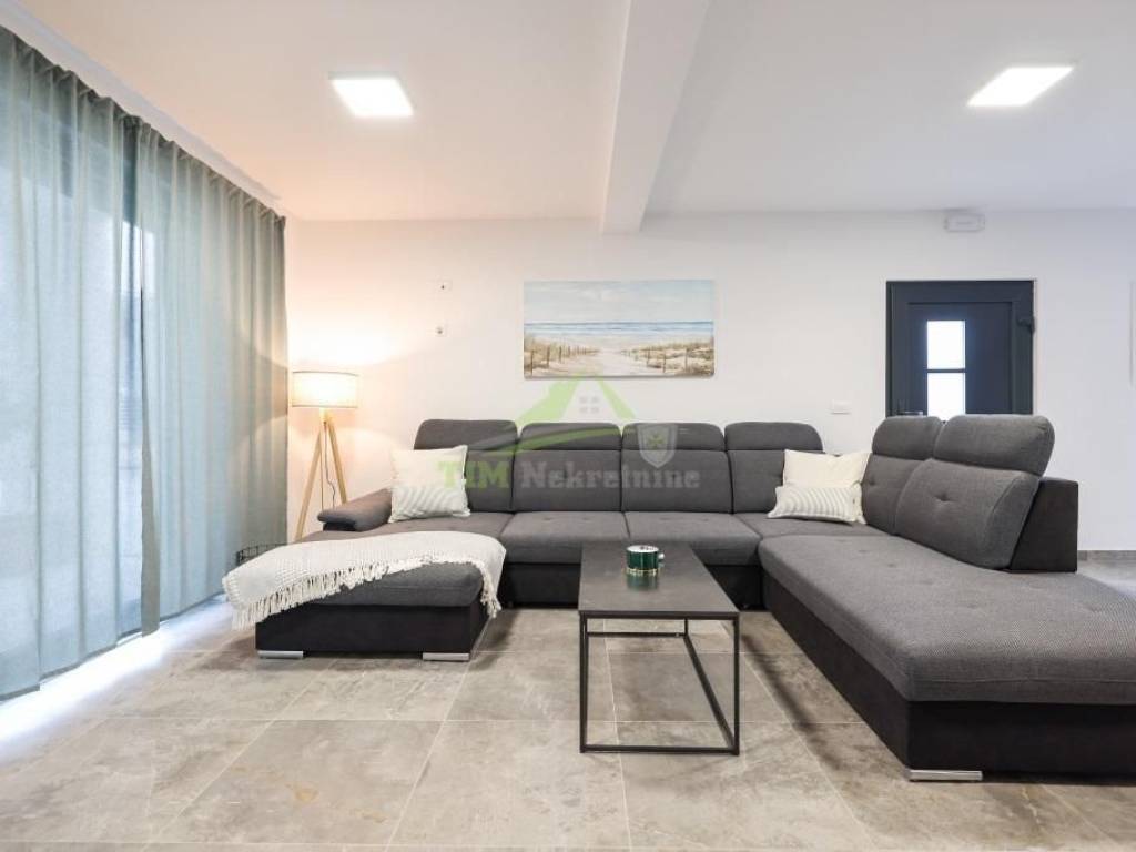 Moderna samostojeća kuća katnica sa grijanim bazenom površine 40 m2 te okućnicom; udaljena svega 150 metara od mora te plaže.Kuća tlocrtne površine 147 m2; smještena na zemljištu ukupne površine 553 m2.Sastoji se od podruma; prizemlja te kata.U samoj gradnji korišteni su najkvalitetniji materijali; vrhunska PVC stolarija sa roletama te komarnicima; sve sobe su klimatizirane te kuća ima vanjsku izolaciju od 10 cm stiropora; grijanje vode pomoću solarnih panela.Od infrastrukture ima priključak struje; vode iz bunara; kanalizacija je ugrađena (bio jama).Uz grijani bazen na predivno uređenoj okućnici se također nalazi i sunčalište površine 40 m2; vanjski roštilj te tuš.Kuća je u potpunosti namještena te kao takva spremna za useljenje.Ispred kuće se nalazi parking za 5 parkirnih mjesta.