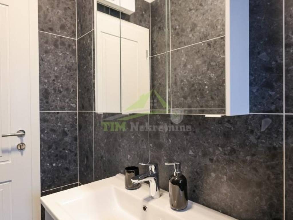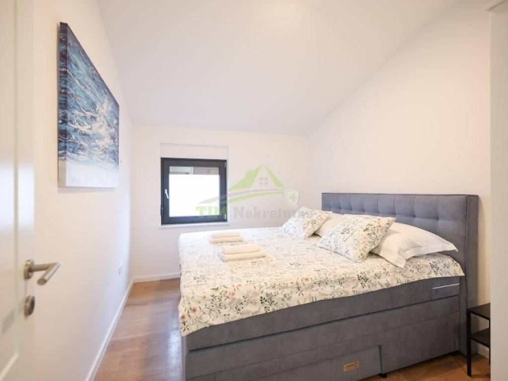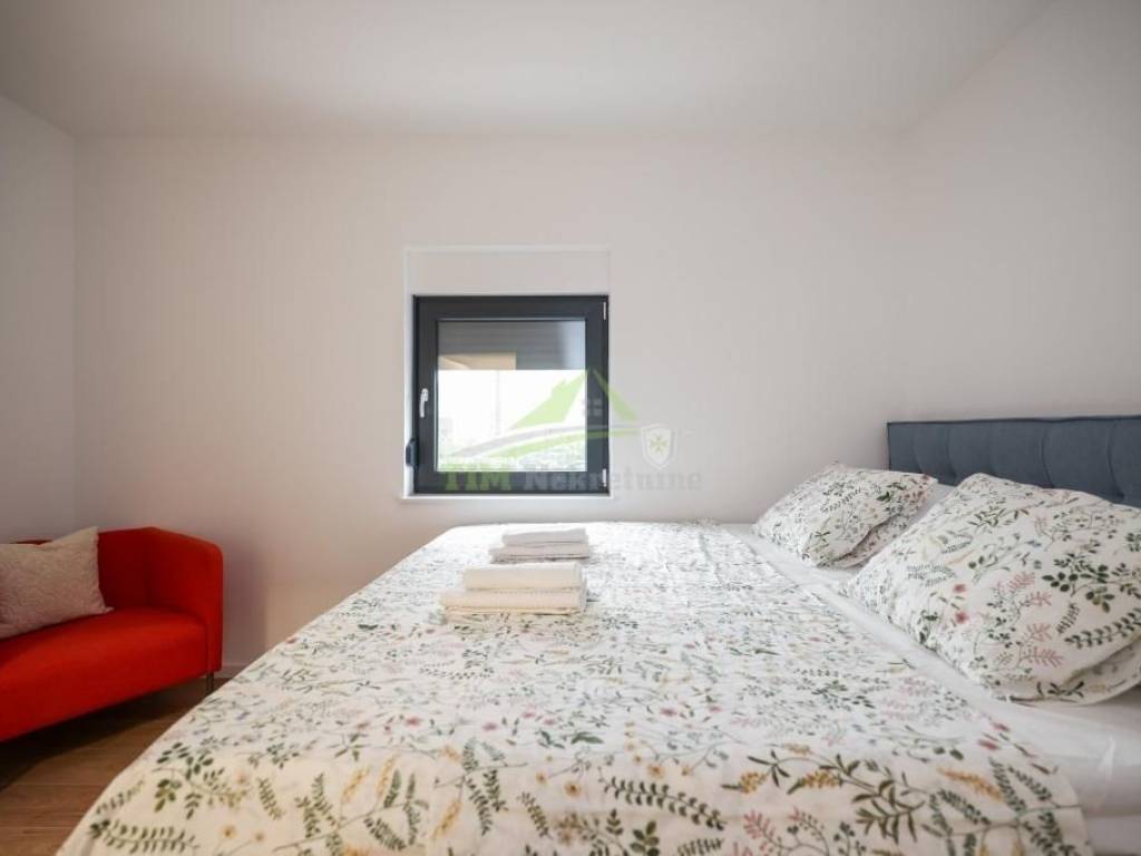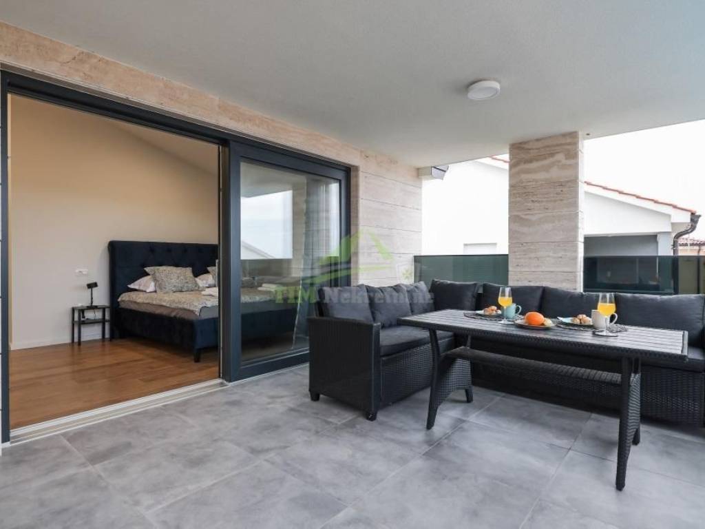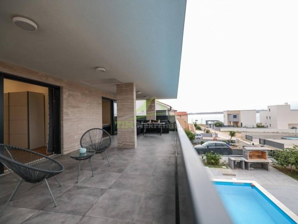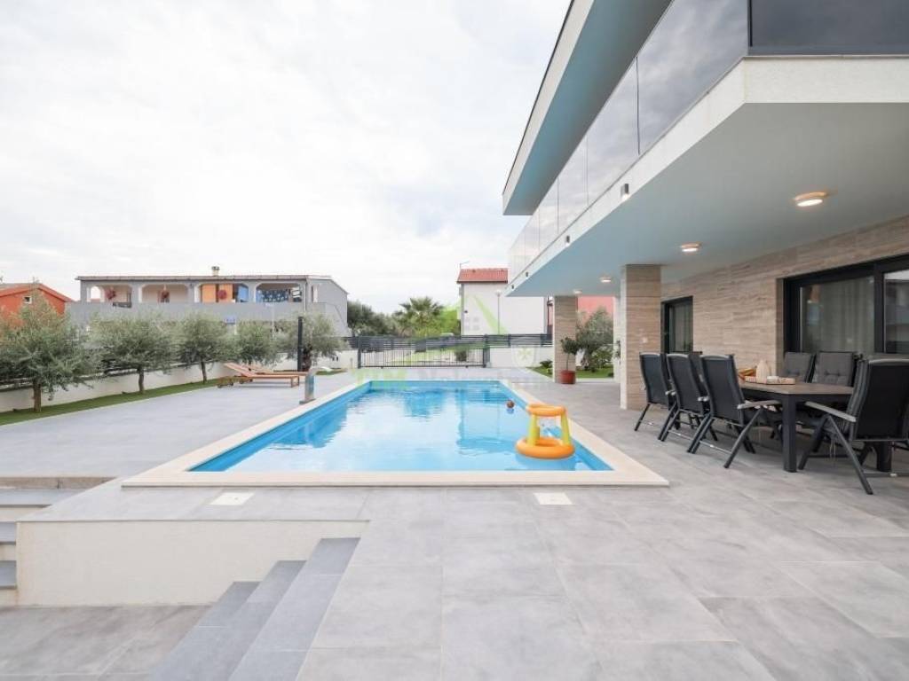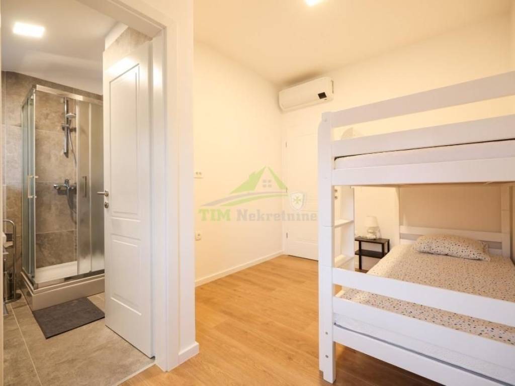 Moderna samostojeća kuća katnica sa grijanim bazenom površine 40 m2 te okućnicom; udaljena svega 150 metara od mora te plaže.Kuća tlocrtne površine 147 m2; smještena na zemljištu ukupne površine 553 m2.Sastoji se od podruma; prizemlja te kata.U samoj gradnji korišteni su najkvalitetniji materijali; vrhunska PVC stolarija sa roletama te komarnicima; sve sobe su klimatizirane te kuća ima vanjsku izolaciju od 10 cm stiropora; grijanje vode pomoću solarnih panela.Od infrastrukture ima priključak struje; vode iz bunara; kanalizacija je ugrađena (bio jama).Uz grijani bazen na predivno uređenoj okućnici se također nalazi i sunčalište površine 40 m2; vanjski roštilj te tuš.Kuća je u potpunosti namještena te kao takva spremna za useljenje.Ispred kuće se nalazi parking za 5 parkirnih mjesta.
