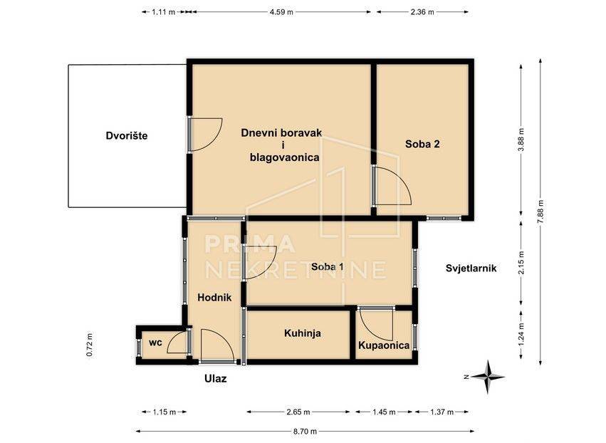 Three bedroom apartment on the ground floor in Mesnička Street. It consists of a living room with dining area, two bedrooms, kitchen, terrace, bathroom and separate toilet. The apartment has storage in the basement. it is oriented to the north side of the world. Tenants use the common parking space in the yard of the building.