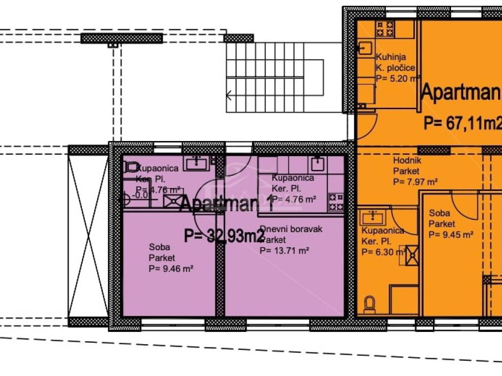APARTMENT 2 located on the ground floor of the building, net area 67.11m2, consisting of: entrance, hallway, kitchen, dining room and living room, two bedrooms, and bathroom. The apartment includes part of the garden and one parking space. PRICE: €350,000.00