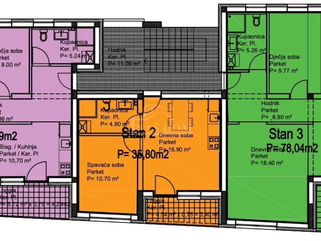 S3 apartment located on the first floor of the building, net area 78.04m2, consisting of entrance, hallway, bathroom, two bedrooms, kitchen with dining area, living room, and loggia of 11.12m2. The apartment includes one parking space. PRICE: €390,000.00