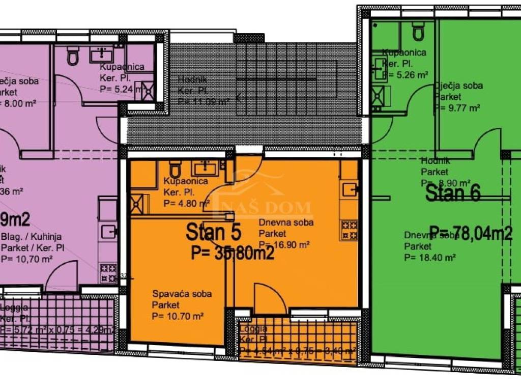 S6 apartment located on the second floor of the building, net area 78.04m2, consisting of entrance, anteroom, bathroom, two bedrooms, kitchen with dining area, living room with access to a loggia of 8.34m2. The apartment includes one parking space. PRICE: €350,000.00