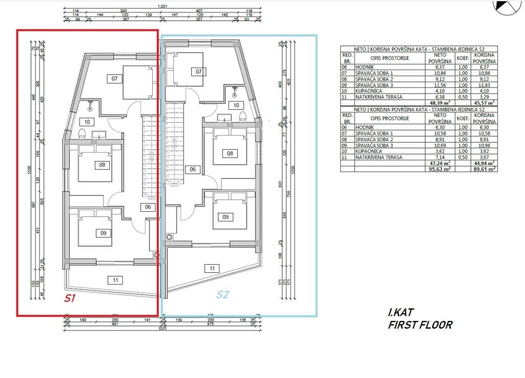 S1 house with a net area of 101.61 m2 consists of the ground floor and upper floor. The ground floor with a net area of 53.22 m2 consists of a covered entrance, storage room, bathroom, staircase, kitchen with dining area and living room, and a covered terrace. The upper floor with a net area of 48.39 m2 consists of a hallway, three bedrooms, bathroom, and covered terrace.