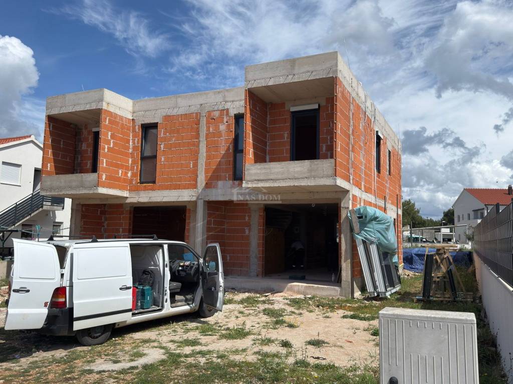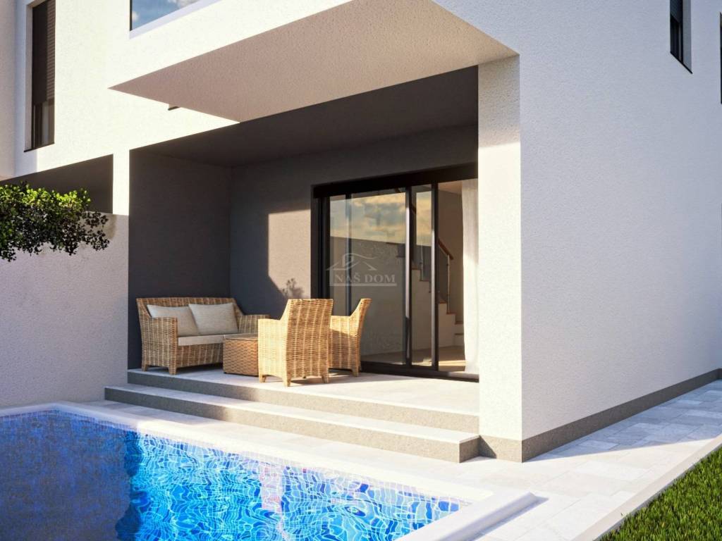 Vodice - **NEW CONSTRUCTION** a semi-detached house with a pool is for sale in a quiet location, with a total usable area of 86.56 m² and consists of two floors: ground floor + first floor. The house also includes a yard of 150 m² with two parking spaces included. The modern-looking house will be built with quality materials and will be equipped according to the latest construction standards: Styrofoam facade, PVC joinery, shutters with electric lifts, insect screens, 2 air conditioners, electric underfloor heating throughout the apartment, quality floor coverings, modern bathroom sanitary ware, basic equipment for the pool...
