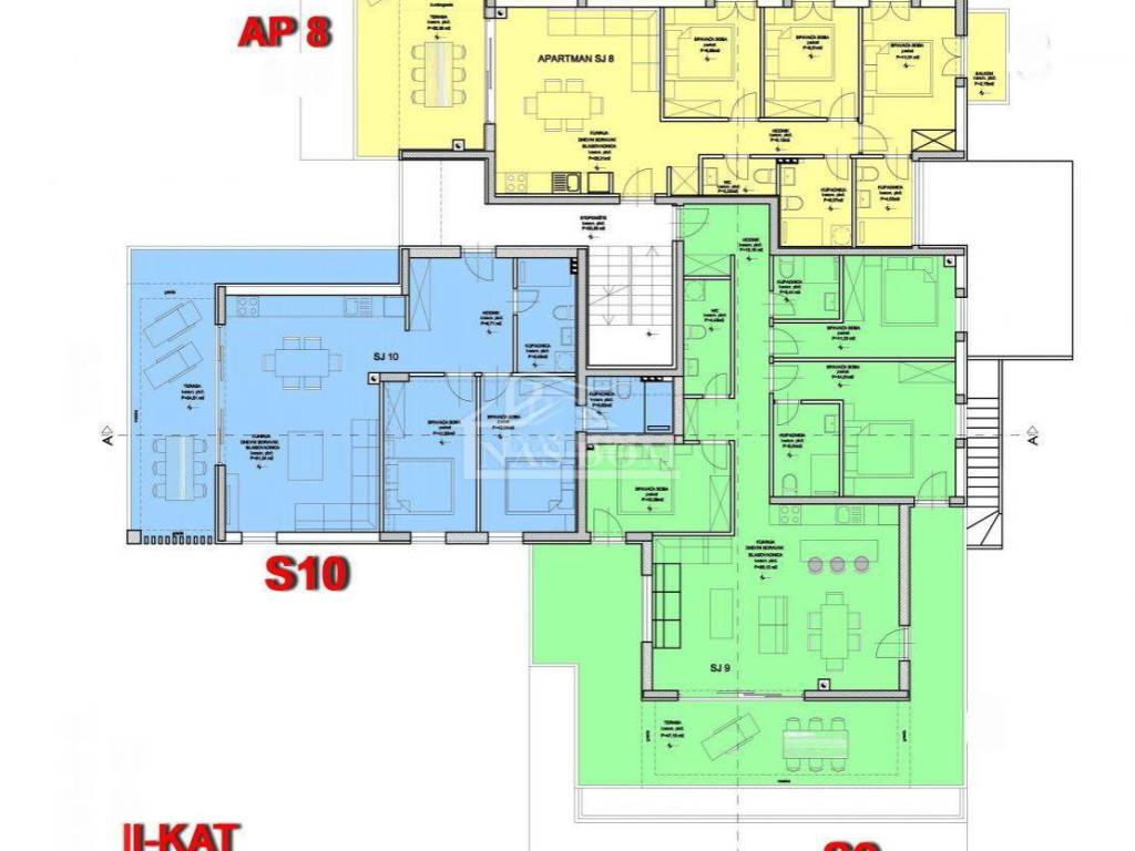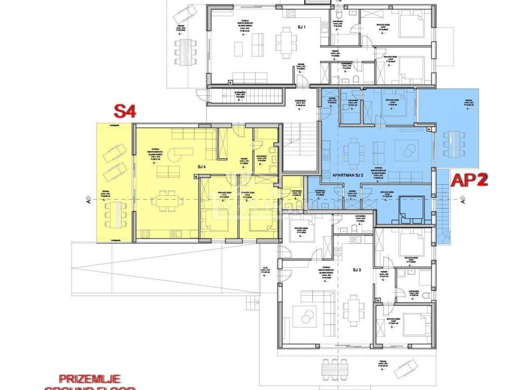 Apartment S6 is located on the first floor of the building, has 137.38m2 net usable area, and consists of: hallway, bedroom 1 with bathroom 1, bedroom 2 with bathroom, bedroom 3, bathroom, kitchen with dining room and living room with exit to the terrace of 8.29 m2, and a balcony of 4.08 m2. The apartment has one garage space and a storage room in the basement.