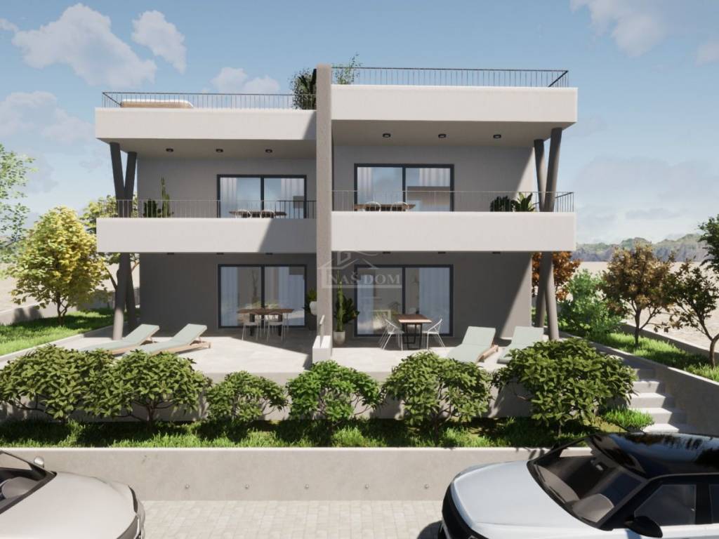 Vodice **NEW CONSTRUCTION** A modern 2.5-room apartment (2BR+DB) is for sale on the ground floor of a small building with a modern appearance. The building, with a total of 4 residential units, has three floors: ground floor + first floor + roof terrace. On the ground floor, there are two apartments with gardens, and on the first floor, two apartments with roof terraces.