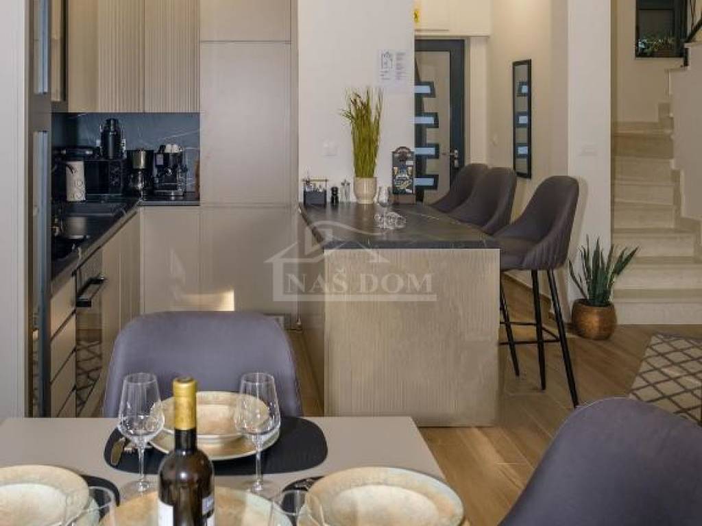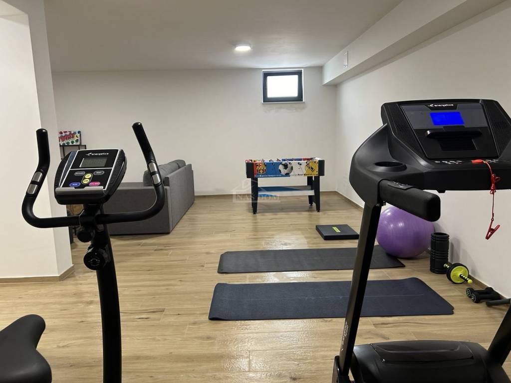 Vodice-**NEW BUILDING** *CENTER* a house in a row is for sale. The house has a total usable area of 177.45m2 and consists of 4 levels: basement + ground floor + first floor + second floor. The basement is used as a fitness room/playroom. The ground floor consists of a hallway, two staircases, a bathroom, a kitchen, a dining room, and a living room, as well as a terrace with a usable area of 12m2. On the first floor, there are three bedrooms, a hallway, a bathroom, and a staircase to the second floor where there is a roof terrace with a usable area of 20.63m2 and a pool with a usable area of 14.10m2. The apartment includes a garden with a usable area of 15.32m2 and two parking spaces with a usable area of 26.90m2.