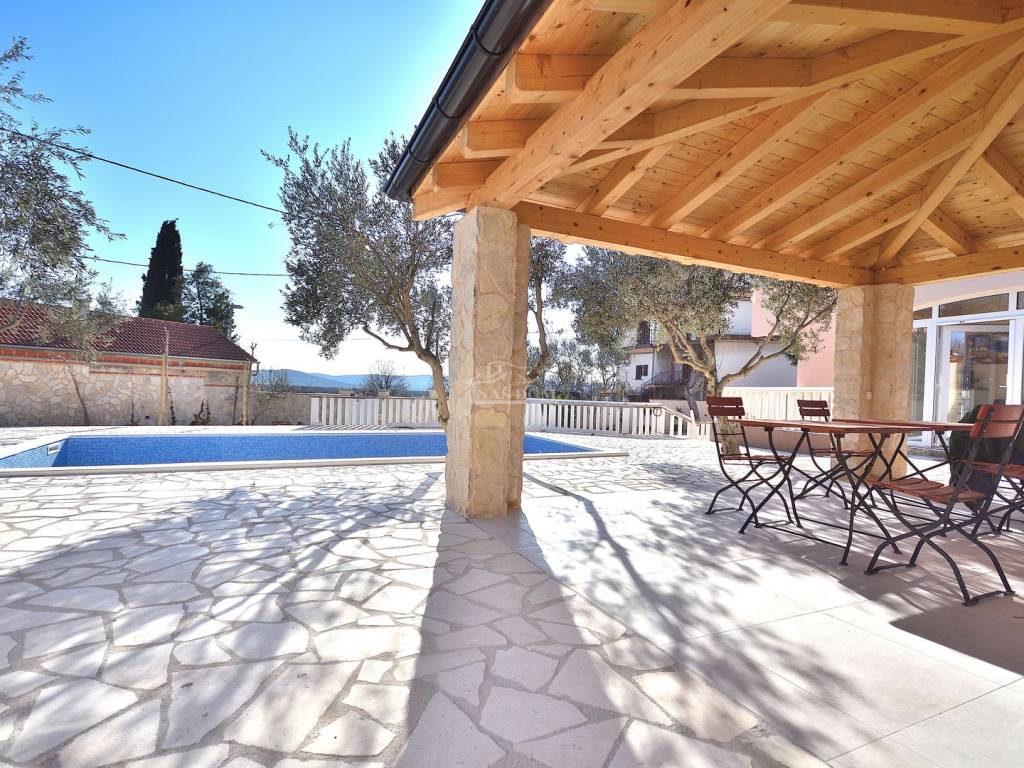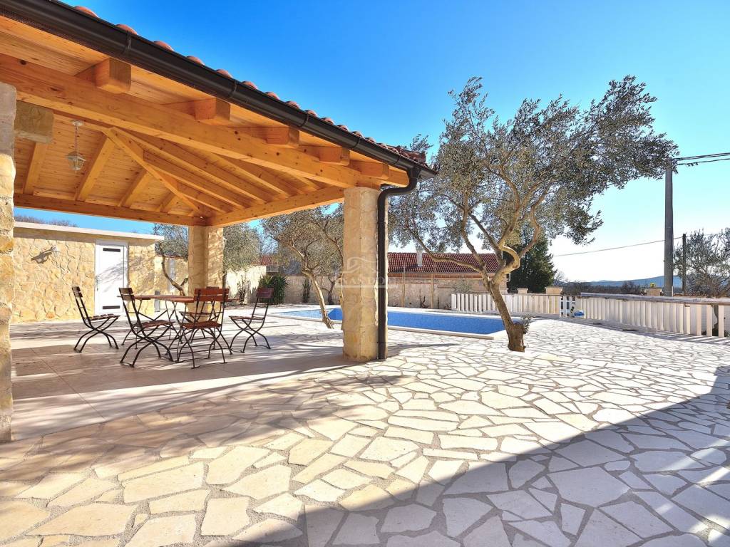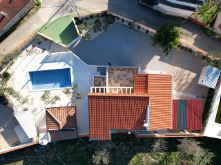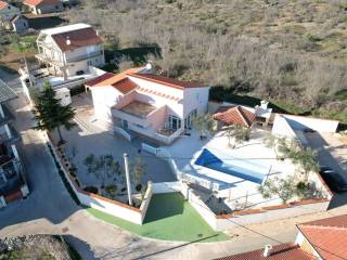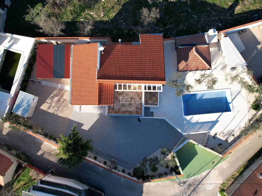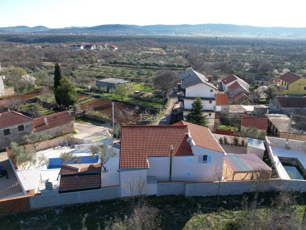 Vodice, Čista Mala - prodaje se kuća s bazenom u malom mjestu u zaleđu Vodica. Kuća je sagrađena 1984 godine na zemljištu ukupne veličine 927m2 i kompletno je renovirana 2024. godine kad je napravljena nova fasada, krov, oluci, pvc stolarija s komarnicima i aluminijske rolete bijele boje, novi estrih, žbuka, kompletno nova električna i vodovodna instalacija, moderne kupaonske sanitarije, kvalitetne keramičke pločice, laminat u spavaćim sobama, klima uređaji, aluminijska automatska klizna vrata na ulazu u posjed.... Villa ima i manji podrum koji se može koristiti ovisno o želji kupca kao vinski podrum I/ili dodatni prostor za odlaganje.