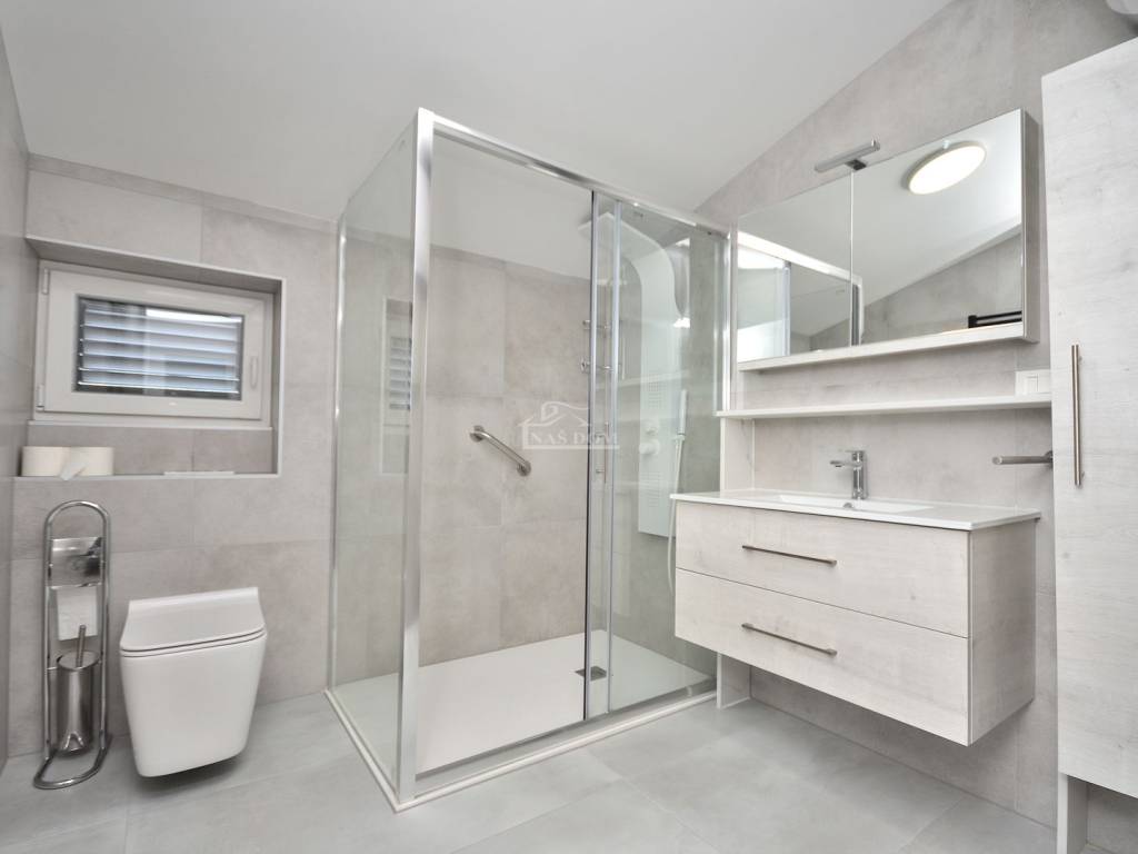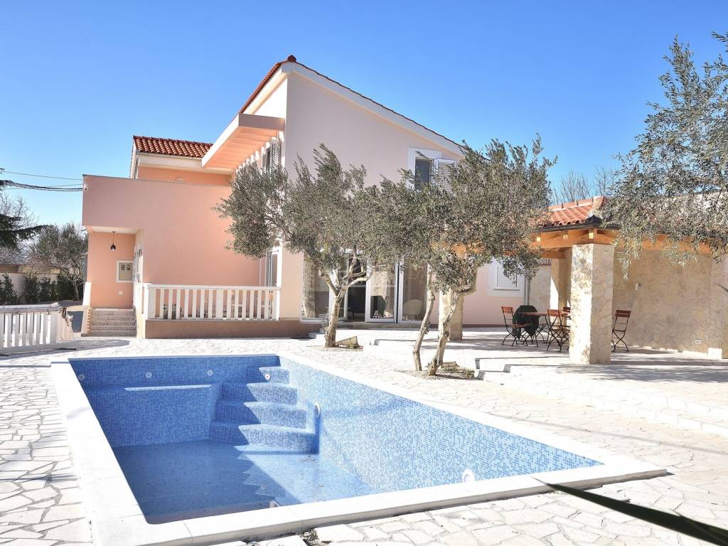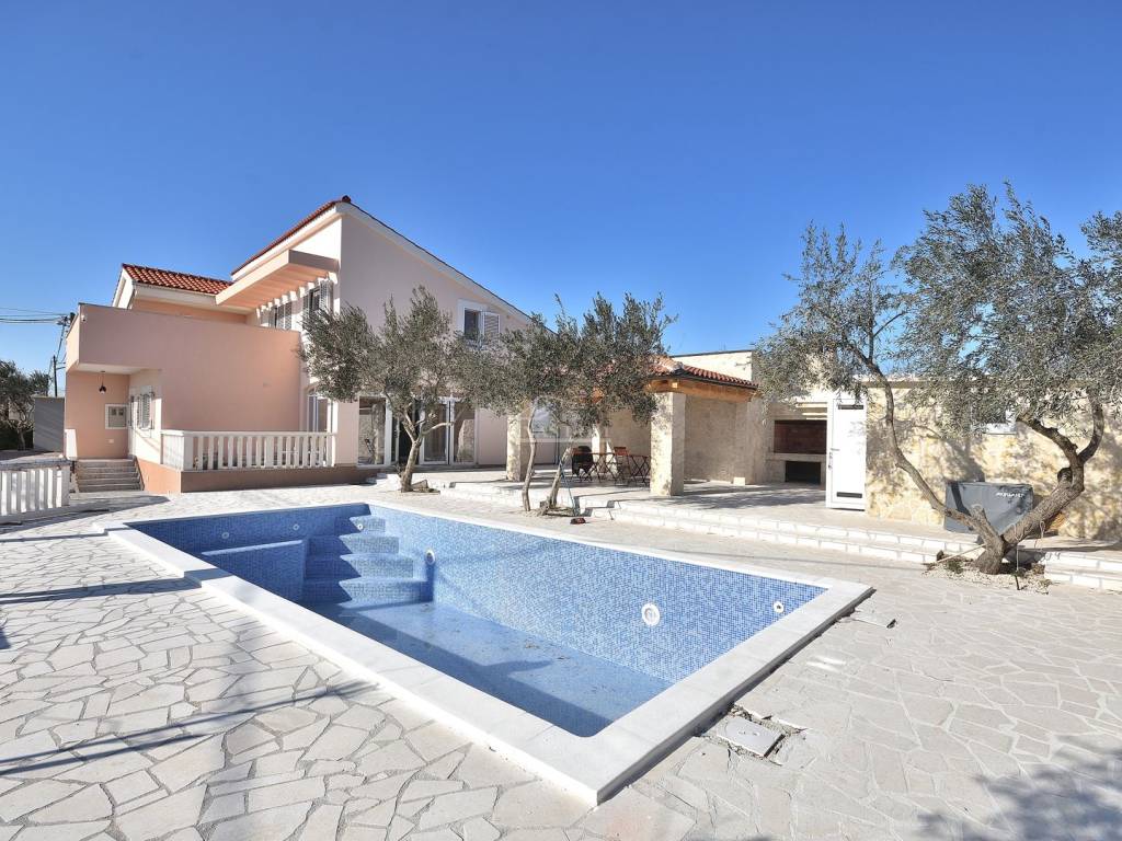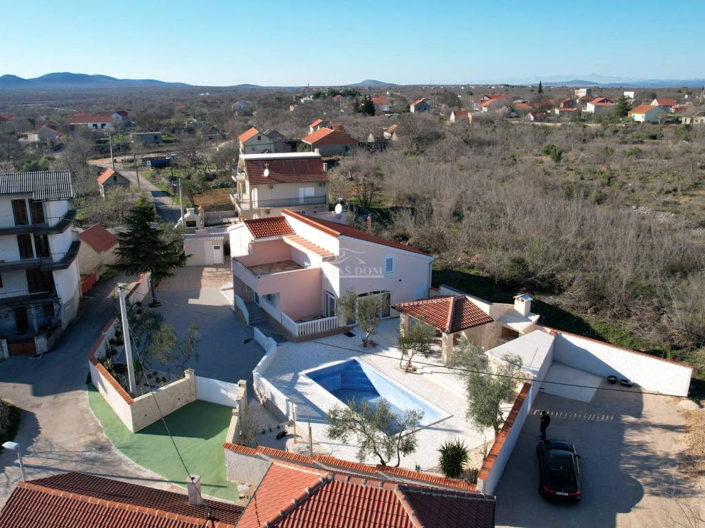 Vodice, Čista Mala - prodaje se kuća s bazenom u malom mjestu u zaleđu Vodica. Kuća je sagrađena 1984 godine na zemljištu ukupne veličine 927m2 i kompletno je renovirana 2024. godine kad je napravljena nova fasada, krov, oluci, pvc stolarija s komarnicima i aluminijske rolete bijele boje, novi estrih, žbuka, kompletno nova električna i vodovodna instalacija, moderne kupaonske sanitarije, kvalitetne keramičke pločice, laminat u spavaćim sobama, klima uređaji, aluminijska automatska klizna vrata na ulazu u posjed.... Villa ima i manji podrum koji se može koristiti ovisno o želji kupca kao vinski podrum I/ili dodatni prostor za odlaganje.