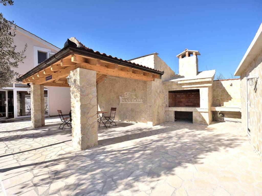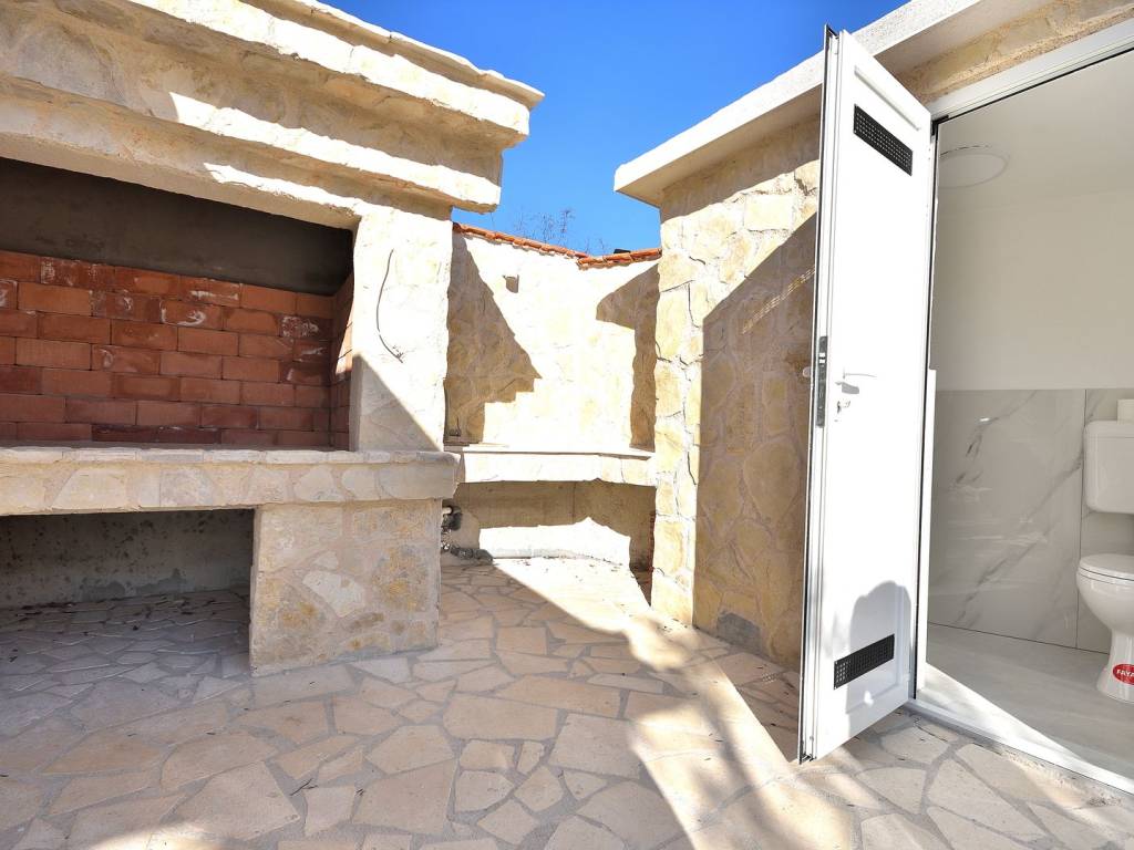 Okućnica kuće je ograđena novim kamenim zidovima i u potpunosti je uređena te se sastoji od bazena sa sunčalištem, ostava, vanjski wc, roštilj s ljetnom kuhinjom i prostor za boravak na otvorenom, vrt koji je kultiviran mediteranskim biljem te natkriveno parkiralište za automobile.
