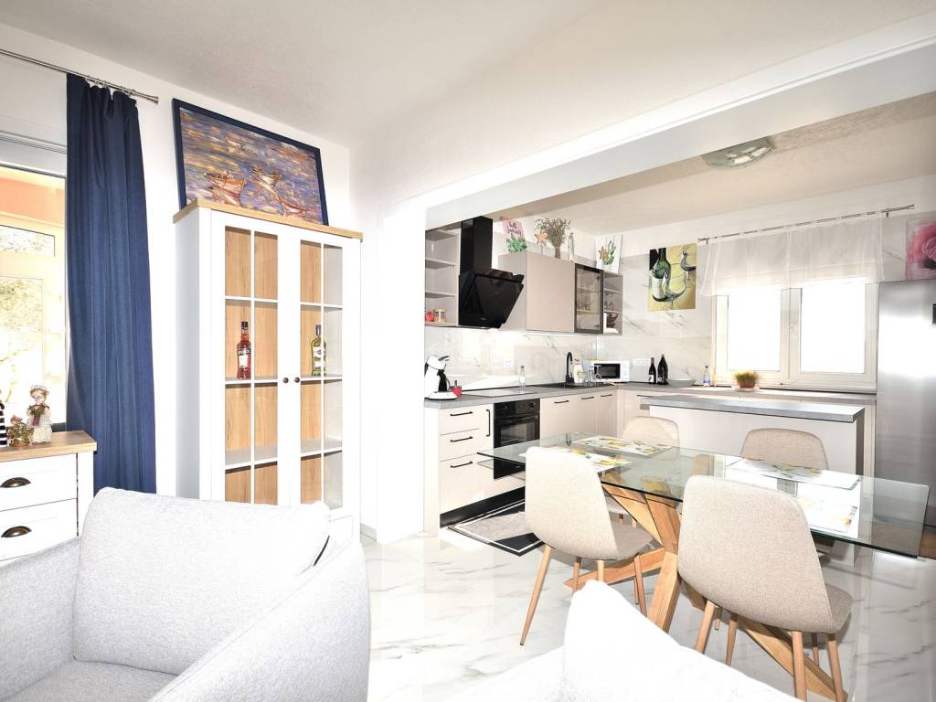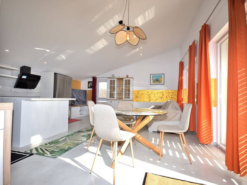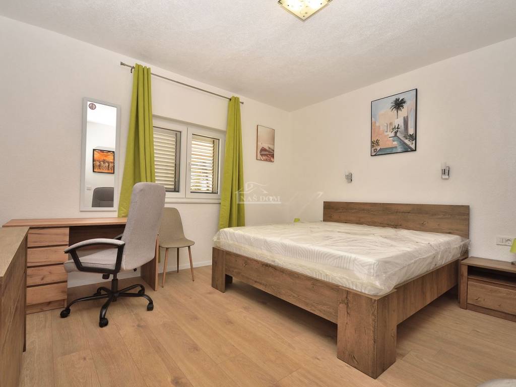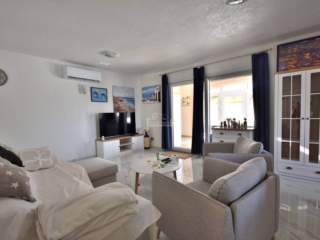 Kuća je u cijelosti namještena i opremljena modernim namještajem. Nalazi se na mirnoj lokaciji, u malom selu u zaleđu Vodica jod kojih e udaljena oko 15 km, a u blizini se nalazi i izlaz na autoput.